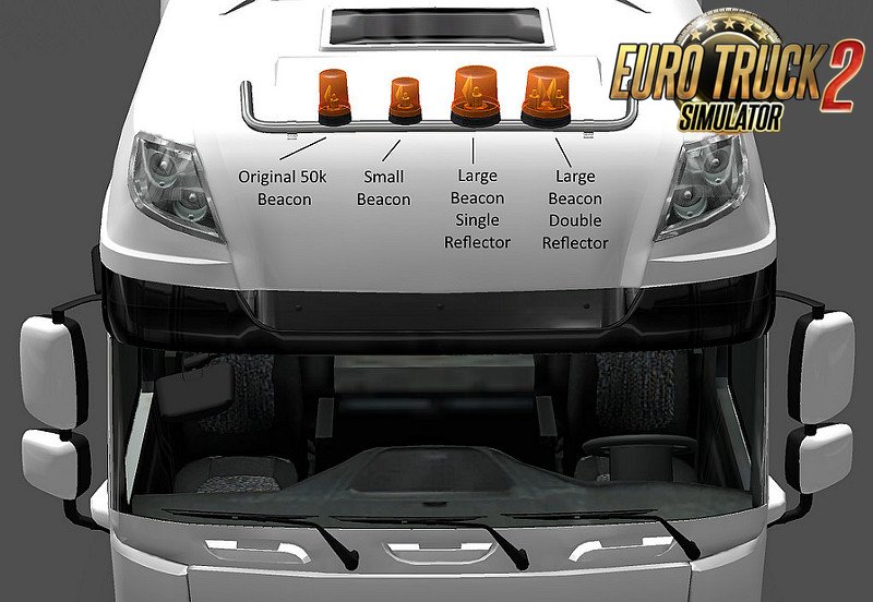 This pack contains modified versions of 50keda's beacon. Also compatible with small beacon slots on MADster's MANs. Many thanks to 50keda for use of the original model. New Version 1.4: - updated for compatibility with ETS2 v1.35.x *New version will not work with game version 1.34 or less. Credits: CobraBlue6, 50keda |