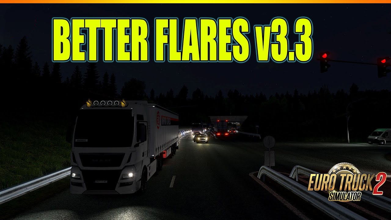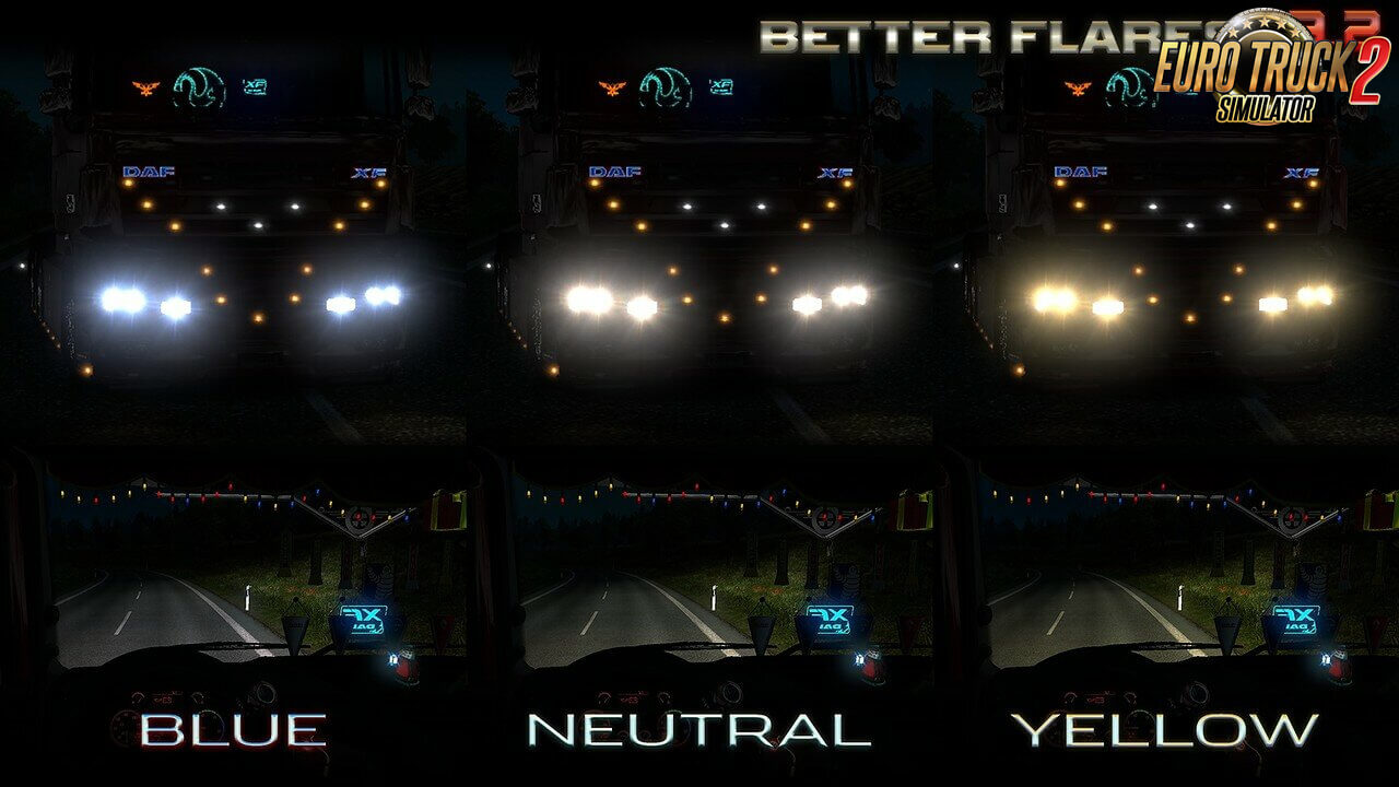 Better Flares - the mod replaces the standard light of headlights and lamps with a better one and significantly improves their visibility. The headlights are improved, the range of lighting is changed. Better Flares 3.3 is an adapted version of Better Flares 3.2, with converted textures to latest. Features Better Flares Mod: - New flares. Choose the one you like. - New truck lights and smooth lights switching. - Traffic lights addon including 8 new flares for AI cars. Changes in v3.3.4: - adapted to the latest game version 1.39.x Load Order - BFv3.3 Headlights (blue/Yellow/Neutral - CHOOSE ONLY ONE) - BFv3.3 LED Traffic light addon (optional) - BFv3.3a Base - BFv3.3 Jazzycat add-ons (optional) - Jazzy packs - Other Traffic add-ons - BFv3.3 Default Traffic addon - Other Mods (trucks trailers maps etc) Credits: Aveliumar, Update: paokkerkir |