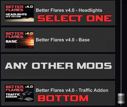 Key features: – Completely reworked flares – Realistic headlights patterns (up to 50 modded trucks supported) – Modified SCS AI traffic with 9 headlights color variants and 2 red/brake signals IMPORTANT! Place TRAFFIC ADDON at the very bottom of Mod Manager, below other mods to avoid errors and crashes Credits Avelium Credits: Avelium |