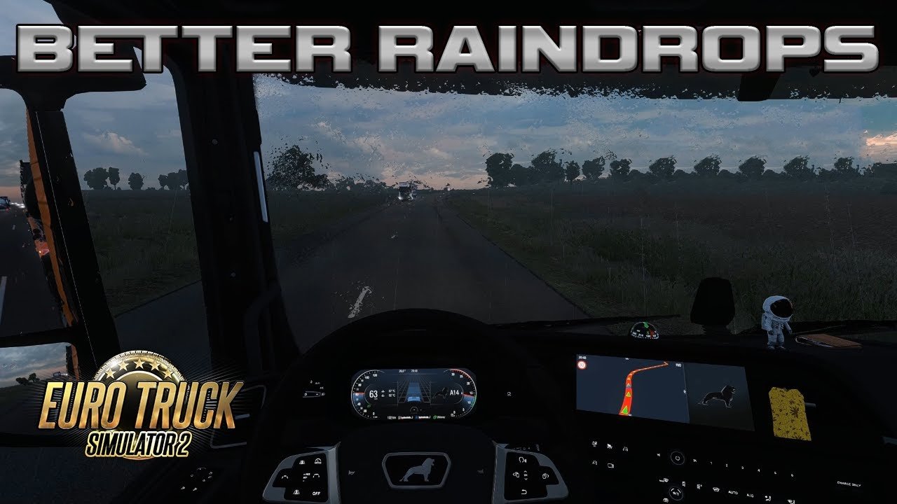 update v1.4.1 (both for ATS and ETS2): - Improved car splash trails (more randomness and less brighter texture) - Changed outside rain texture - Truck Addon (It is a sub-mod that triples number of raindrops but ONLY FOR ETS2 SCS TRUCKS) - TSRM fix (for SCS Truck Sounds Reworked MEGAPACK) Known issues: In Base mod some drops will spawn beyond side windows and hang in the air. This was done on purpose specifically to reduce particle density on them and will be noticeable only with the lowered windows. If you don't like this effect delete truck folder located in better_raindrops_v1.4\def\vehicle\ If you experiencing performance issues after installing Truck Addon, try to reduce traffic by entering console command g_traffic 0.5. Change the number to find optimal balance between amount of AI cars and your FPS in the rain Credits: Avelium |