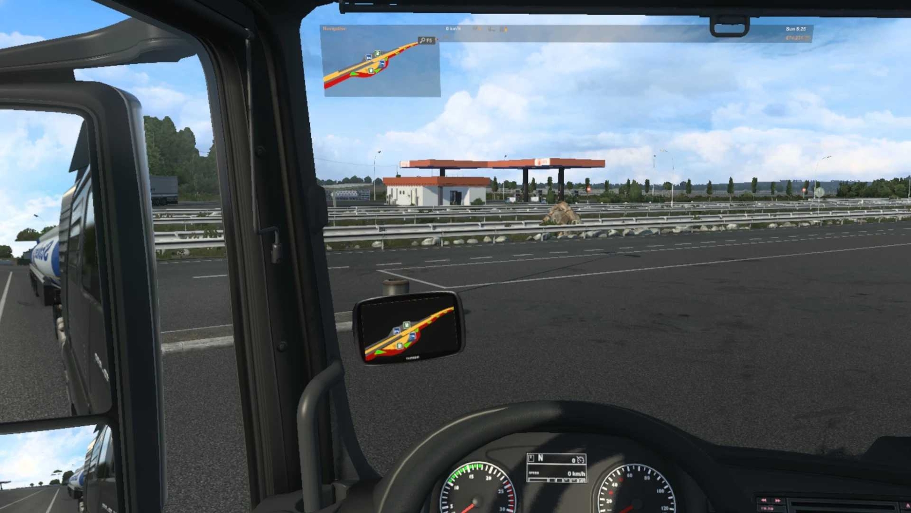 Rearranged layout of the route adviser elements for playing in VR. The route adviser UI position can be moved in relation to your VR position by editing the relevant fields in the config.cfg file which is typically found in …\documents\European Truck Simulator 2. Note that this can be done without using a mod, and 1.46 has added additional position adjustments (x, y, pitch & yaw) which were not previously available, so if you only want to move the original route adviser then just change the relevant config.cfg field values below. It is best to adjust these to suit your own preference but I will put my settings below for an example. I recommend using 0.1, or 0.05 increments for small adjustments to ‘x’ and ‘y’ fields, while using increments of 5 or 10 for the ‘fov’ and ‘dist’ fields. If you would like to change these values while in the game you will need to enable the developer console and make changes there. For the route adviser while in-game (original values): uset r_manual_stereo_ui_pitch_game “0” # pitch of the route adviser UI (in degrees) uset r_manual_stereo_ui_yaw_game “0” # yaw of the route adviser UI (in degrees) uset r_manual_stereo_ui_y_game “0” # vertical position of the route adviser UI uset r_manual_stereo_ui_x_game “0” # horizontal position of the route adviser UI uset r_manual_stereo_ui_fov_game “100” # scale of the route adviser UI uset r_manual_stereo_ui_dist_game “0.5” # distance of the route adviser UI For the game menus (original values): uset r_manual_stereo_ui_fov “80” # scale of the game menu UI uset r_manual_stereo_ui_dist “0.8” # distance of the game menu UI Credits: FateOfNorns |