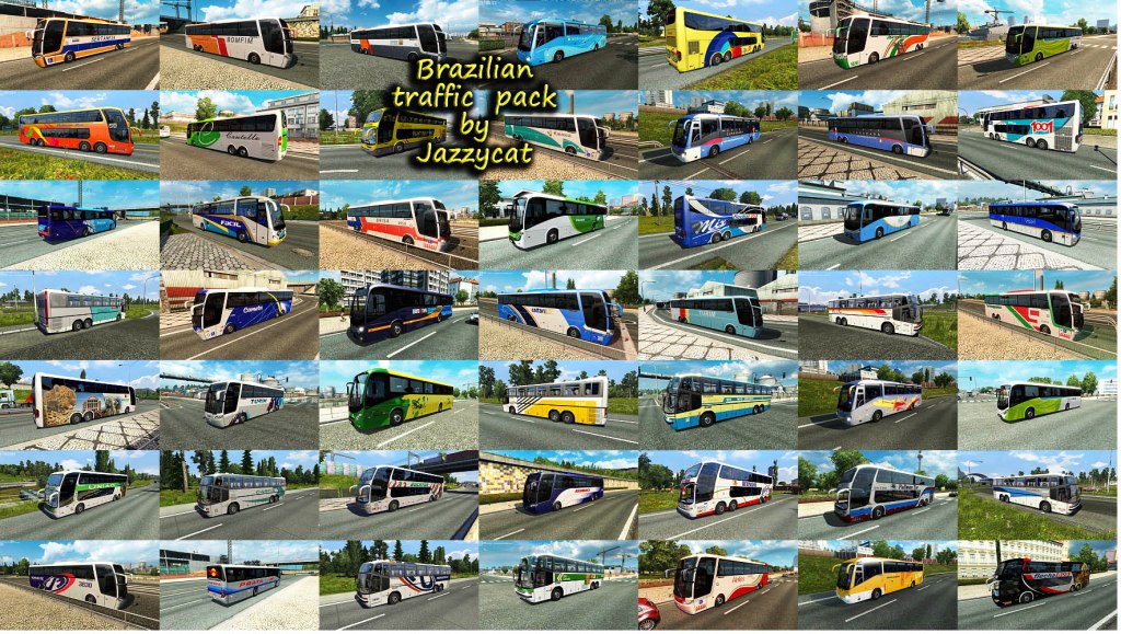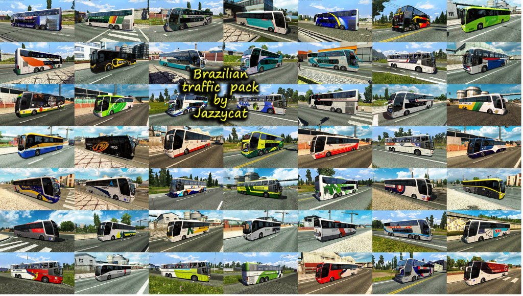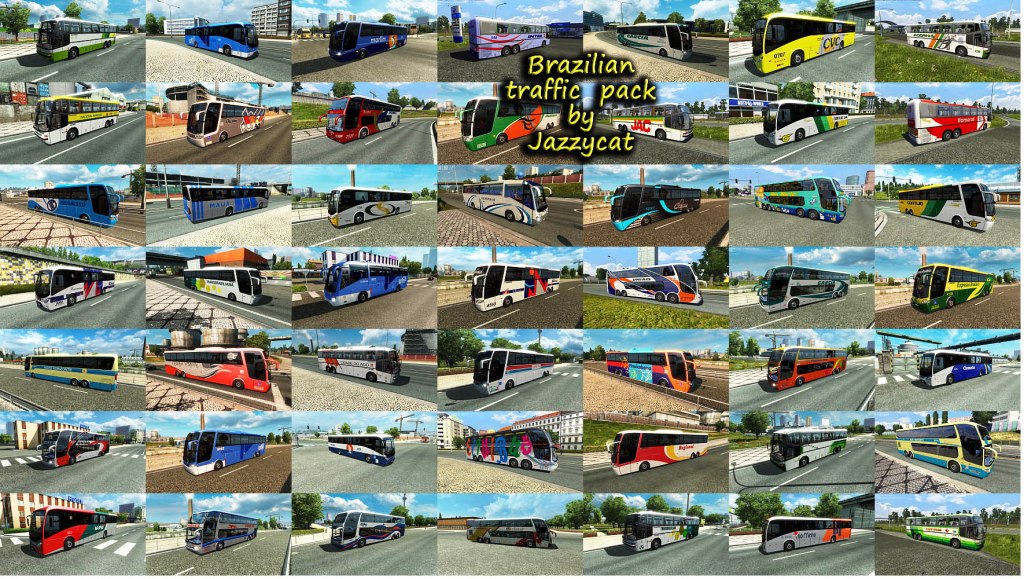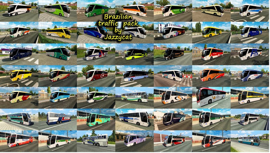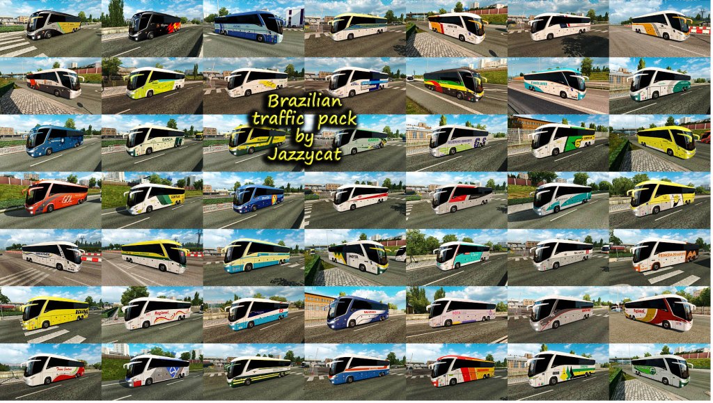 Pack adds in traffic vehicles for Brazilian maps. Cars: Volkswagen Fusca, Gol(G3, G5), Kombi, Parati'02, Quantum, Santana, Saveiro'09, Voyage'09, Amarok Chevrolet Chevette SL/E, Monza 'Tubarao', Opala Diplomata SE, S10, Cruze, Celta Fiat 147, Mille Fire, Palio Weekend, Strada Ford Corcel, EcoSport, Escort, Ranger, Fusion, Pampa Honda Fit, Civic'07 Sedan Jeep Wrangler Nissan D21, Frontier, Sentra Peugeot Hoggar Escapade Renault Kangoo Mitsubishi L200 Toyota Hilux Trucks: Volkswagen Constellation Ford Cargo 2842 Scania 113H Buses: Marcopolo Ideale 770, Paradiso GV 1150, Paradiso G6 1200(4x2), 1800DD(6x2, 8x2), Paradiso G7 1200(6x2), 1600(6x2, 8x2) Busscar Jumbus 360, Panoramico DD, Vissta Buss LO Irizar PB, New Century For version 1.35.x Compatible with all my packs. Includes some skins from other South America countries. For Brazil vehicles only on Brazil maps you must have in mod folder 2 files: brazilian_traffic_pack_by_Jazzycat_v2.2.2_base.scs brazilian_traffic_pack_by_Jazzycat_v2.2.2_eaa_rbr.scs For Brazil vehicles everywhere only 1 file: brazilian_traffic_pack_by_Jazzycat_v2.2.2_base.scs Credits: JAZZYCAT |