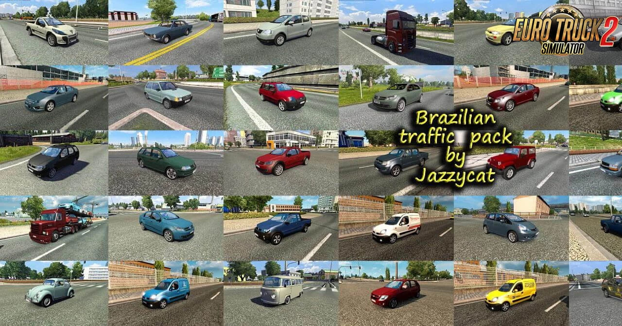 Pack adds in traffic 68 vehicles for Brazilian maps. Cars: Volkswagen Fusca, Gol(G3, G5), Kombi, Parati’02, Quantum, Santana, Saveiro(G4, G5), Voyage’09, Amarok, Virtus, CrossFox Chevrolet Chevette SL/E, Monza ‘Tubarao’, Opala Diplomata SE, S10, Cruze, Celta, Montana, Corsa Classic Fiat 147, Mille Fire, Palio Weekend, Strada, Toro, Uno Ford Corcel, EcoSport, Escort, Ranger, Fusion, Pampa Honda Civic’07, Fit Hyundai HB20 Jeep Wrangler Dodge Journey Nissan D21, Sentra Peugeot Hoggar Escapade Renault Kangoo Mitsubishi L200 Toyota Hilux, SW4 Trucks: Volkswagen Constellation, Meteor Ford Cargo 2842 Scania 113H Mercedes-Benz 1634 Volvo VM Buses: Marcopolo Ideale 770, Paradiso G6 1200, 1800DD(6×2, 8×2), Paradiso GV 1150, Paradiso G7 1200(6×2), 1600(6×2, 8×2) Busscar Jumbus 360, Panoramico DD, Vissta Buss LO Irizar PB, New Century Comil Campione DD 6×2 CMA Flecha Azul All standalone. Works on any maps. Compatible with all my packs. For version 1.42.x Includes some skins from other South America countries. For Brazil vehicles only on Brazil maps you must have in mod folder 2 files: brazilian_traffic_pack_by_Jazzycat_v3.6_base.scs brazilian_traffic_pack_by_Jazzycat_v3.6_brazil.scs For Brazil vehicles everywhere only 1 file: brazilian_traffic_pack_by_Jazzycat_v3.6_base.scs Version 3.6 – added new skins of real Brazilian companies for Randon trailer Credits: JC |