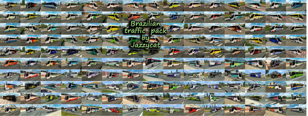 Pack adds in traffic 71 vehicles for Brazilian maps. Cars: Volkswagen Fusca, Gol(G3, G5), Kombi, Parati’02, Quantum, Santana, Saveiro(G4, G5), Voyage’09, Amarok, Virtus, CrossFox Chevrolet Chevette SL/E, Monza ‘Tubarao’, Opala Diplomata SE, S10, Cruze, Celta, Montana(’08, ’11), Corsa Classic Fiat 147, Mille Fire, Palio Weekend, Strada, Toro, Uno Ford Corcel, EcoSport, Escort, Ranger, Fusion, Pampa Honda Civic’07, Fit Hyundai HB20, Azera Jeep Wrangler Dodge Journey Nissan D21, Sentra Peugeot Hoggar Escapade Renault Kangoo, Master Mitsubishi L200 Toyota Hilux, SW4 Trucks: Volkswagen Constellation, Meteor Ford Cargo 2842 Scania 113H Mercedes-Benz 1634, 1934 Volvo VM Buses: Marcopolo Ideale 770, Paradiso G6 1200, 1800DD(6×2, 8×2), Paradiso GV 1150, Paradiso G7 1200(6×2), 1600(6×2, 8×2) Busscar Jumbus 360, Panoramico DD, Vissta Buss LO Irizar PB, New Century Comil Campione DD 6×2 CMA Flecha Azul All standalone. Works on any maps. Compatible with all my packs. For version 1.46.x Includes some skins from other South America countries. For Brazil vehicles only on Brazil maps you must have in mod folder 2 files: brazilian_traffic_pack_by_Jazzycat_v5.0_base.scs brazilian_traffic_pack_by_Jazzycat_v5.0_brazil.scs For Brazil vehicles everywhere only 1 file: brazilian_traffic_pack_by_Jazzycat_v5.0_base.scs Version 5.0 – added new vans with skins of real Brazilian companies, improved country definitions Credits: JC |