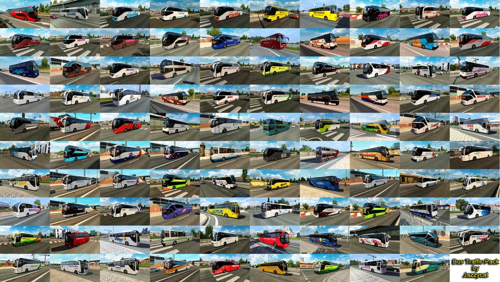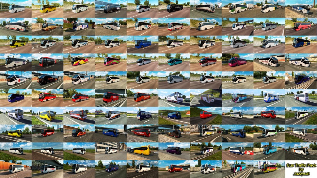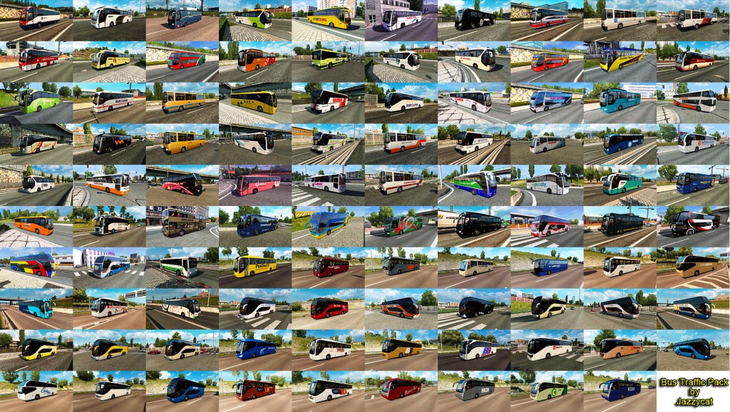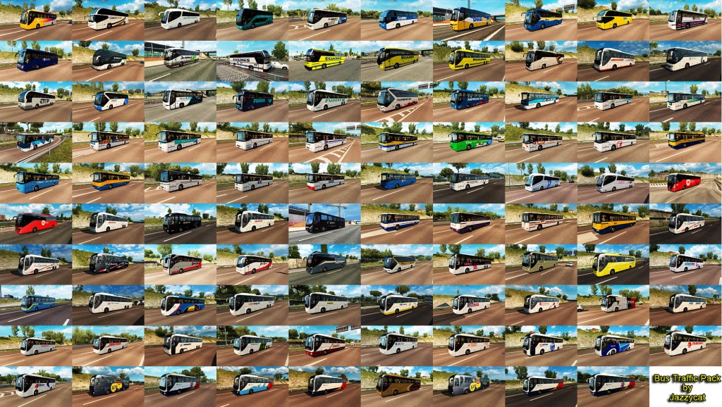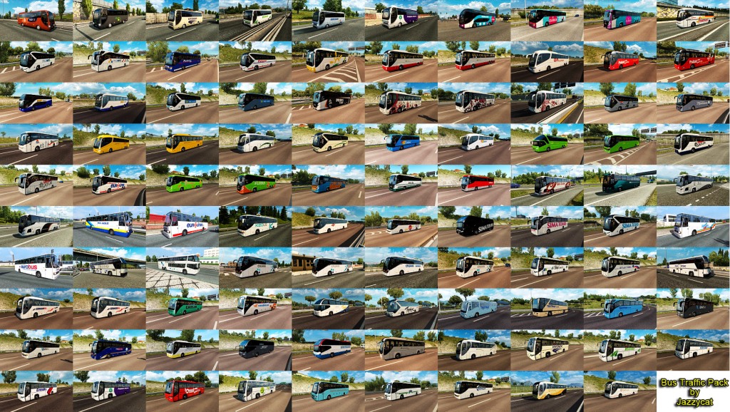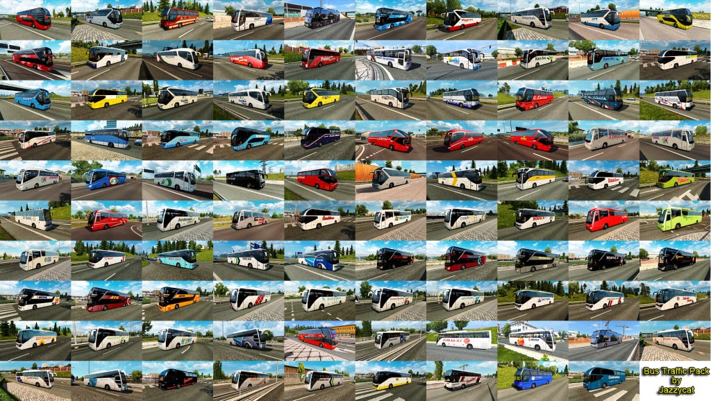 Pack adds in traffic 37 new models of buses with 1073 skins (Setra, Neoplan, Volvo, Man, Mercedes-Benz, Ikarus, Ayats, Irizar, Scania, Temsa, Jelcz, Karosa, Caetano). All standalone, works on any maps. Tested on versions 1.35.x Credits: JAZZYCAT |