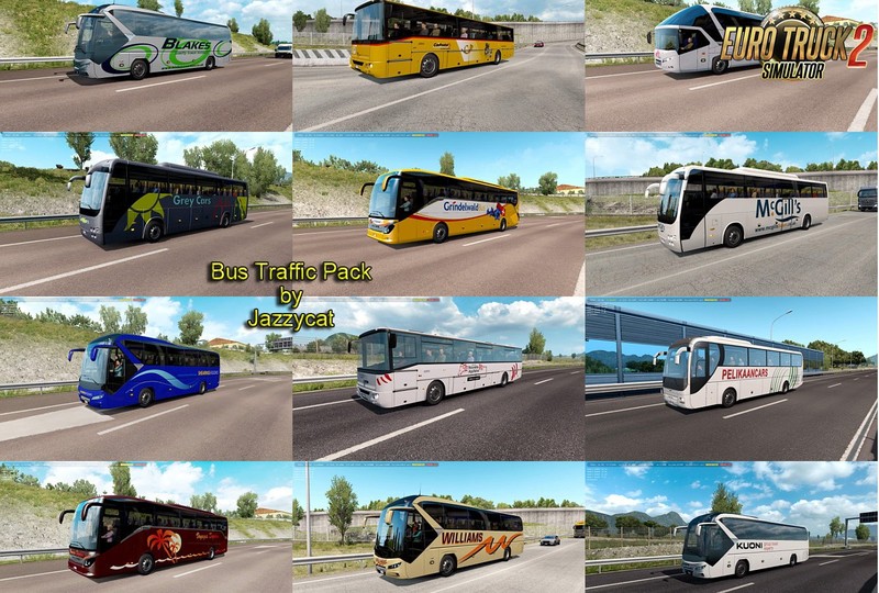 Pack adds in traffic 46 new models of buses with about 1500 skins (Setra, Neoplan, Volvo, Man, Mercedes-Benz, Ikarus, Scania, Ayats, Irizar, Temsa, Irisbus, Jelcz, Karosa, Caetano, Optare). All standalone, works on any maps. Compatible with all my packs. Tested on version 1.47.x Version 16.7 – added new skins of Dutch real bus operators, improved country definitions Credits: JC |