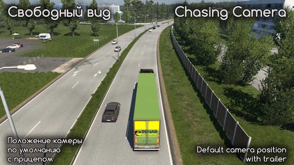 What this mod do? Interior Camera It is possible to look below you (90° down), and above you (90° up). It is possible to look behind the driver’s seat (turn 180°). Adjusted camera shift smoothness (on some trucks, it twitched). Adjusted default view height for all standard trucks. Set default fov to 80° for all standard trucks. Chasing Camera The default position of the camera, allows you to immediately see the truck and trailer in full. Increased camera distance. Increased the angle of the camera up (can be used as an analogue of the “Top-Down Camera”). Top-Down Camera The camera is raised high in the sky, allowing you to see the truck and its trailer on the screen. Lean Out Camera The camera has been moved to the roof of the truck, just behind the cab. It is possible to make up to 3 turns in each direction. Increased fov to 100°. Photo mode” Camera Increased maximum camera flight height. Increased the maximum distance for camera. Increased the maximum zoom ratio (more zoom in and out). Increased camera tilt angles to the side (now the camera can even be turned upside down). Increased camera movement speed. Truck/Trailer Configuration Camera Increased the degree of zooming in and out of the camera. Increased camera up/down angles. In the “Walk” mode, it is possible to be on the roof of the truck, and the roof of the garage. Credits: Hitman Credits: Hitman |