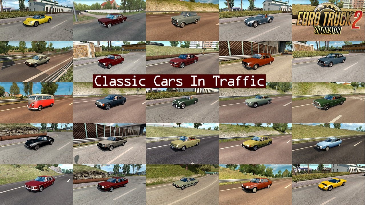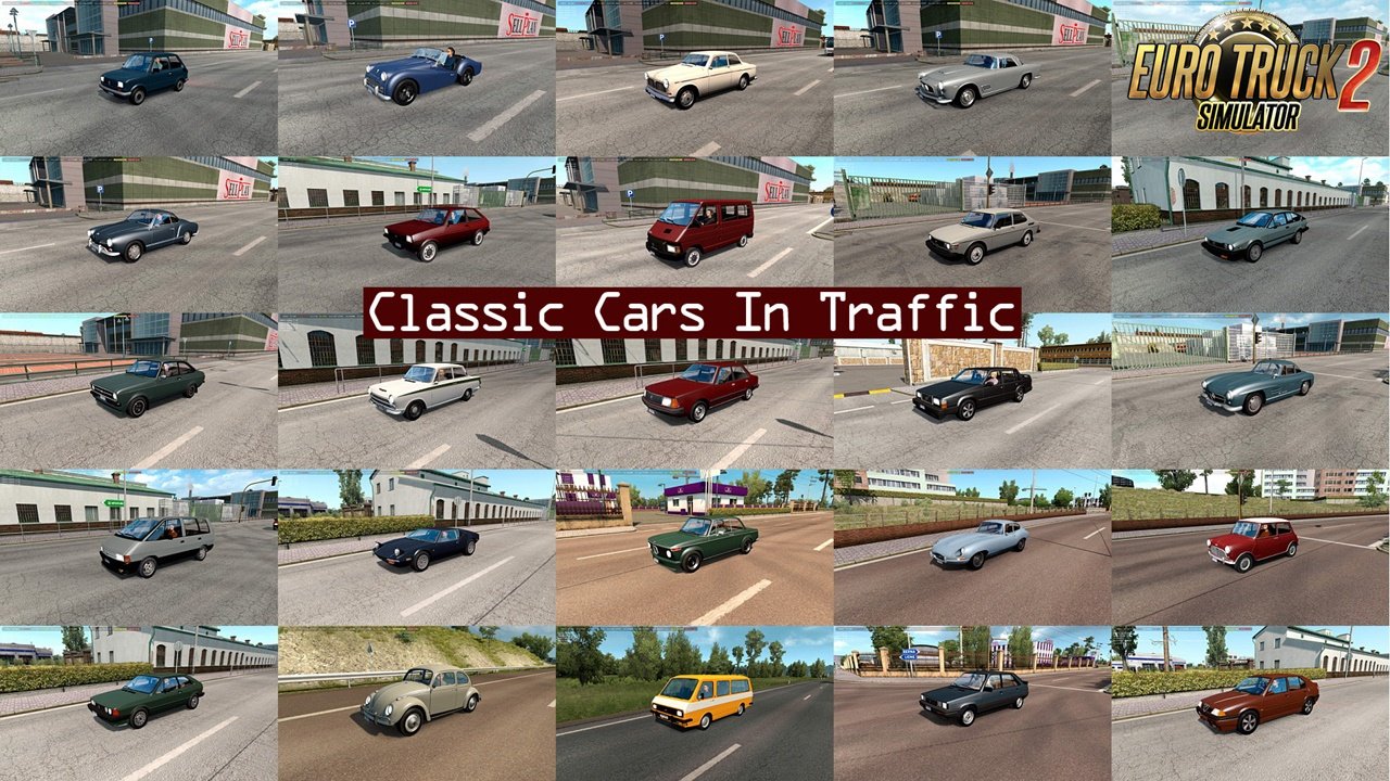 Pack adds in traffic 80 cars from 60th, 70th, 80th years: AC Cobra Alfa Romeo 33, 75, 90, Giulia Sprint, Alfetta GTV Aston Martin DB4 GT, V8 Vantage ’77 Audi 80(B2), 100(C3 Avant) Austin Mini Cooper, Healey BMW 2002, 5(E28), 3.0(E9), 6(E24), 507 Citroen GS, BX, SM Dacia 1300 De Tomaso Pantera Dino 246 Ferrari Daytona Fiat 125P, 126P, 131, Regata, 850 Coupe, Ritmo, Panda Ford Escort II, Sierra, Fiesta Mk1, Anglia, Cortina Jaguar E-Type, XK150 Lamborghini Miura Lancia 037 Stradale, Stratos HF Stradale Lotus Cortina, Elan ’72 Maserati 3500 GT Mazda RX-7 Mercedes-Benz 300SEL, 190, 300SL, W124 MG MGB GT Peugeot 204, 309 Porsche 911 Carrera ’73, 914 RAF 2203 Renault 9, 11, 18, Espace I, Trafic I Saab 99 Skoda 100, 105 Talbot Horizon Tatra 613 Tofas Murat 124 Toyota Corolla(E80, AE86) Trabant 601 Triumph TR3 Volkswagen Beetle, Type 2(T1, T2, T3), Golf 1, Karmann-Ghia, Scirocco 1 Volvo 242, Amazon, 740 All standalone. Works on any maps. Compatible with AI packs by Jazzycat. For version 1.36.x Included two versions: for use only with default traffic and for use with Jazzycats AI pack. You must have in mod folder two files: classic_cars_traffic_pack_by_TrafficManiac_v4.6_base.scs and classic_cars_traffic_pack_by_TrafficManiac_v4.6_def.scs (only with default traffic) or classic_cars_traffic_pack_by_TrafficManiac_v4.6_jaz.scs (with Jazzycats AI pack) Version 4.6 – added Fiat Panda ’82 and Mazda RX-7 ’80 Credits: TrafficManiac Credits: TrafficManiac |