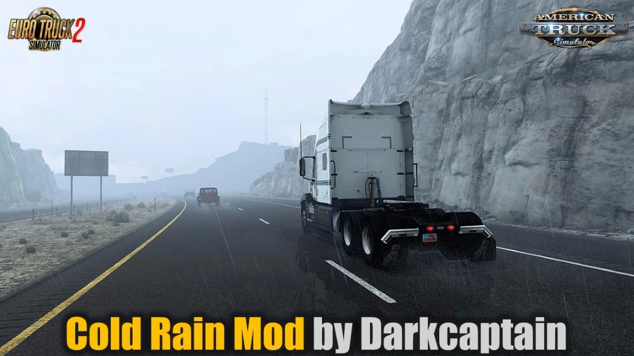 – Textures of raindrops for windows and windshield have been changed – Increased amount of raindrops from inside the cabin – Rain textures have been improved – The effects and behaviors of the drops on the windshield and windows have been changed – The texture and effects of the water particles on the wheels when the asphalt is wet has been changed (affects all vehicles, traffic included) – Realistic rain sounds, such as drops falling in the cabin and the sound of rain with the outside view – Realistic thunders sounds & greater variety (about 20 high quality sounds/samples) Note: The thunder will be heard in an interval of between 1 and 5 seconds when seeing the ‘flash’ (lightning), simulating as in reality. – 1.42.x – 1.43.x versions. No errors in game log. – Support for FMOD Sound System. – Compatible with all DLC’s and it should work with Mods Maps – Compatible with Sound Fixes Pack by Drive Safely – Must have high priority in Mod Manager. ‘Cold Rain’ on top (ABOVE) of Weathers/Graphics, Maps and Sound mods. Changelog: Support for 1.43.x version Darkcaptain AlexeyP (some textures, thanks!) Drive Safely (FMOD Tool parameters compatibility) Robinicus (FMOD Tool guides) Credits: Darkcaptain AlexeyP |