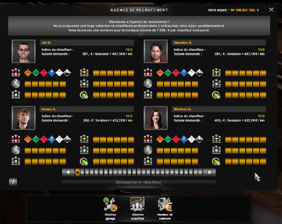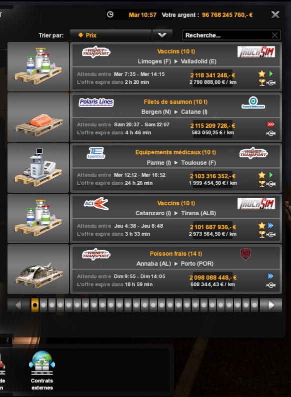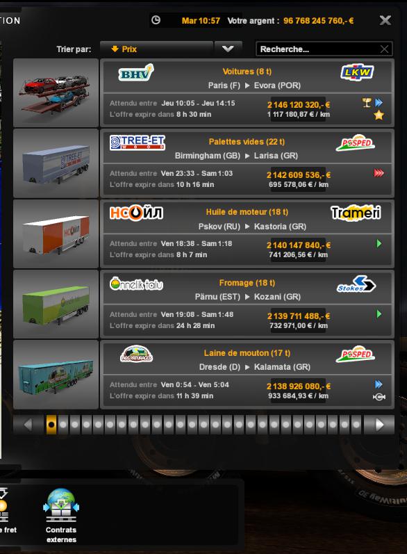 Mod to have many money in the game Base Revenue per KM : 550 Small Garage Price : 18000 Garage Upgrade Price : 10000 Fuel Discount in Garage (Percentage) :70% Truck Count for On-line Purchase : 5 Abandoned Job Fine : 2500 Cargo Damage Cost : 0.00 Cargo Damage Cost factor :0 Delivery Window coefficient (Easy-Medium-Hard): 6200.00 – 6500.15 – 7500.40 Fixed Revenue : 55875000 Revenue Coefficient per KM (freght market) : 15500.90 Revenue Coefficient per KM (Cargo market) : 15500.80 Cargo Delivery Experience : 10.0 Parking Experience Bonus (Easy) : 177500 Parking Experience Bonus (Medium) : 177500 Parking Experience Bonus (Hard) : 177500 Parking Experience Bonus Double (Easy) : 188500 Parking Experience Bonus Double (Medium) : 188500 Parking Experience Bonus Double (Hard) : 188500 Credits: kbahanderson Credits: kbahanderson |