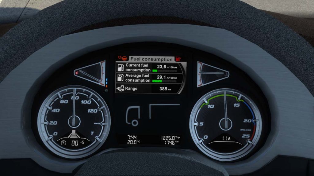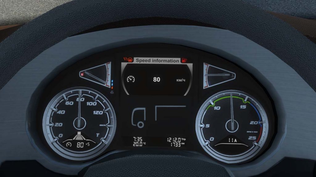 This mod improves the DAF XF 106 dashboard: – complete overhaul mod; – added current speed gauge; – added turbo gauge; – added axle load gauge; – added oil pressure gauge; – added diff temp gauge; – added engine brake icon; – added low fuel icon; – added damage icon; – added cruise control memory icon; – added cruise control tolerance gauge; Changelogs v1.2 – increased the font size of the speed indicator; – bug fixes. Updated for patch 1.45 Credits: Knights Gaming Credits: Knights Gaming |