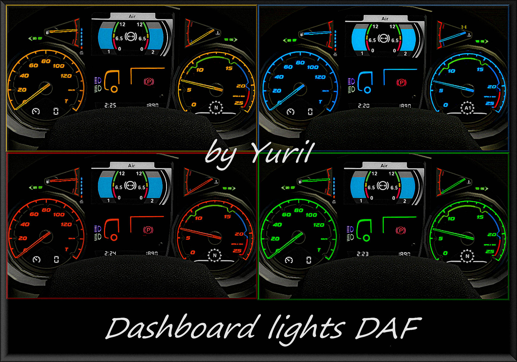 Blue, green, red, yellow. For default trucks DAF. Put one of your choice. v1.36.x-1.39.x Tested on version 1.39.x Credits: YuriI |