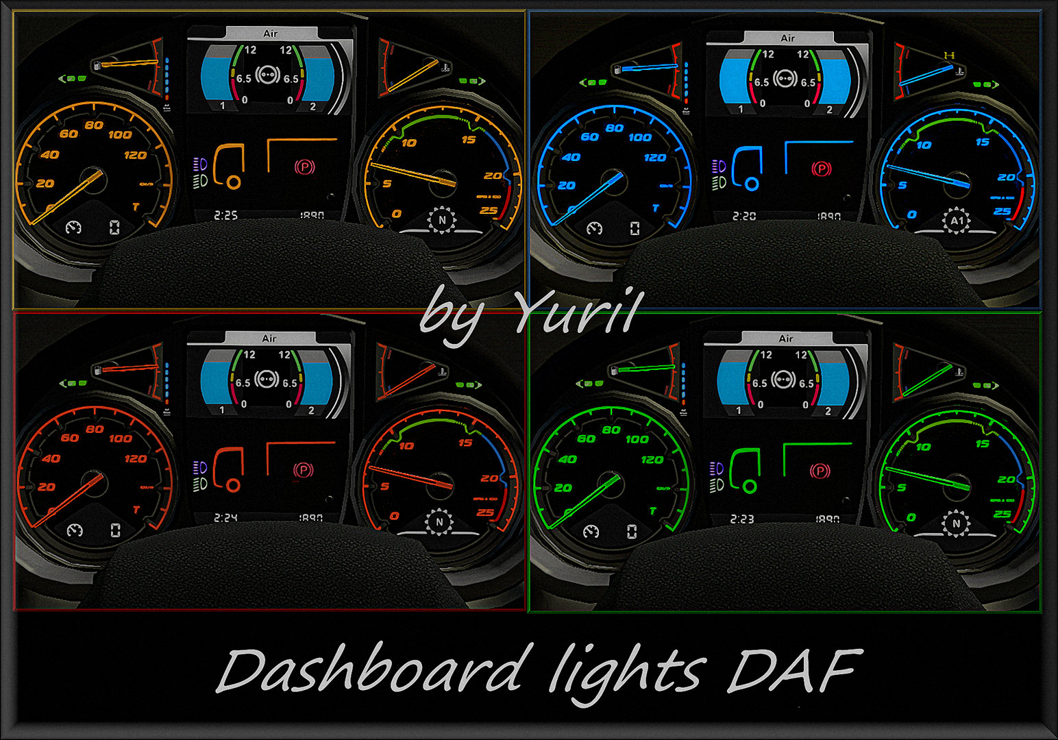 Blue, green, red, yellow. For default trucks DAF. Put one of your choice. v1.36.x-1.40.x Minor fixes. Credits: YuriI |