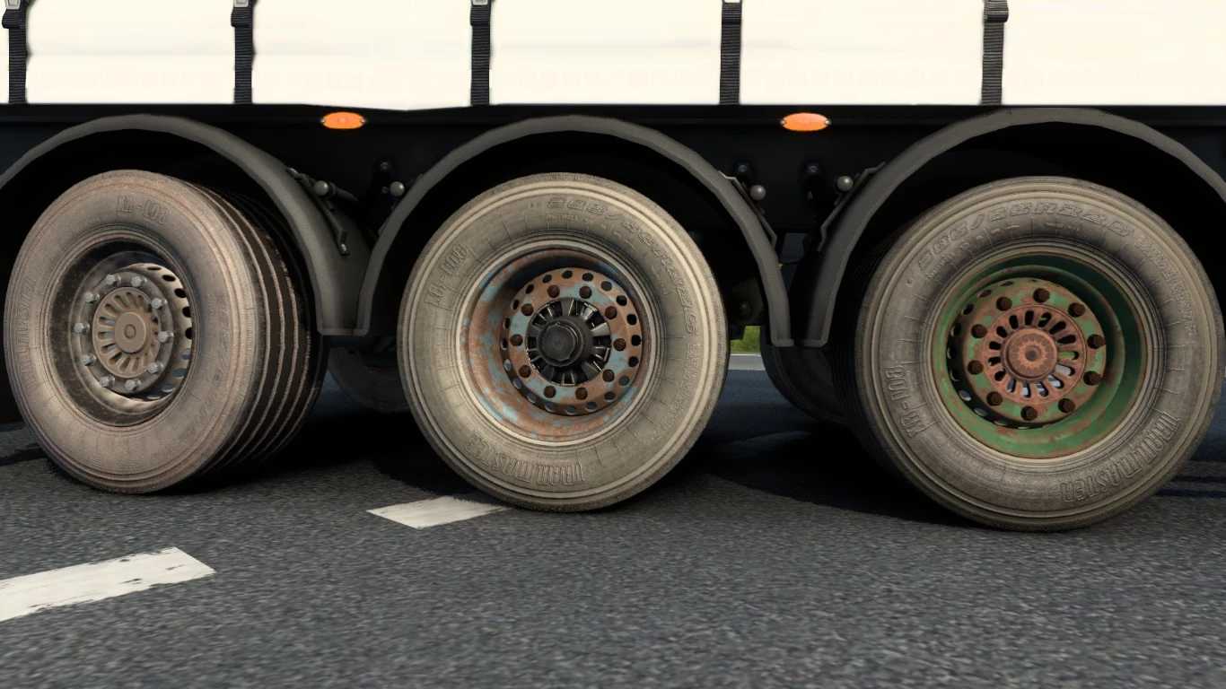Mod adds dirty, dusty, and rusty tires, wheels, nuts, covers, and hubs for trucks and trailers to the game. – several dozen tires, discs, and accessories for them – options for all axes – some of the Good Year tires – Quality textures Credits: Jerry mods |