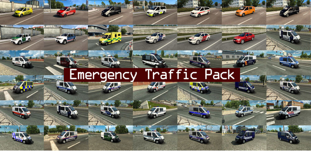 Mod adds to traffic emergency vehicles (Mercedes-Benz Vito, Fiat Ducato, Nissan Pathfinder, Skoda Octavia, Mercedes-Benz Sprinter) in 39 countries: Finland, Albania, Estonia, Russia, Slovakia, Austria, Slovenia, France, Germany, Moldova, Spain, Sweden, UK, Ukraine, Switzerland, Greece, Belgium, Bulgaria, Hungary, Iceland, Croatia, Czech Republic, Italy, Latvia, Netherlands, Norway, Denmark, Liechtenstein, Poland, Portugal, Romania, Lithuania, Luxembourg, Turkey, Tunisia, Algeria, Morocco, Libya, Egypt. All standalone. Works on any maps. Compatible with other traffic mods. For game version 1.45.x Some skins by Solaris36 Version 1.2.3 – added compatibility for Maghreb Map (country definitions) Credits: TrafficManiac Credits: TrafficManiac |