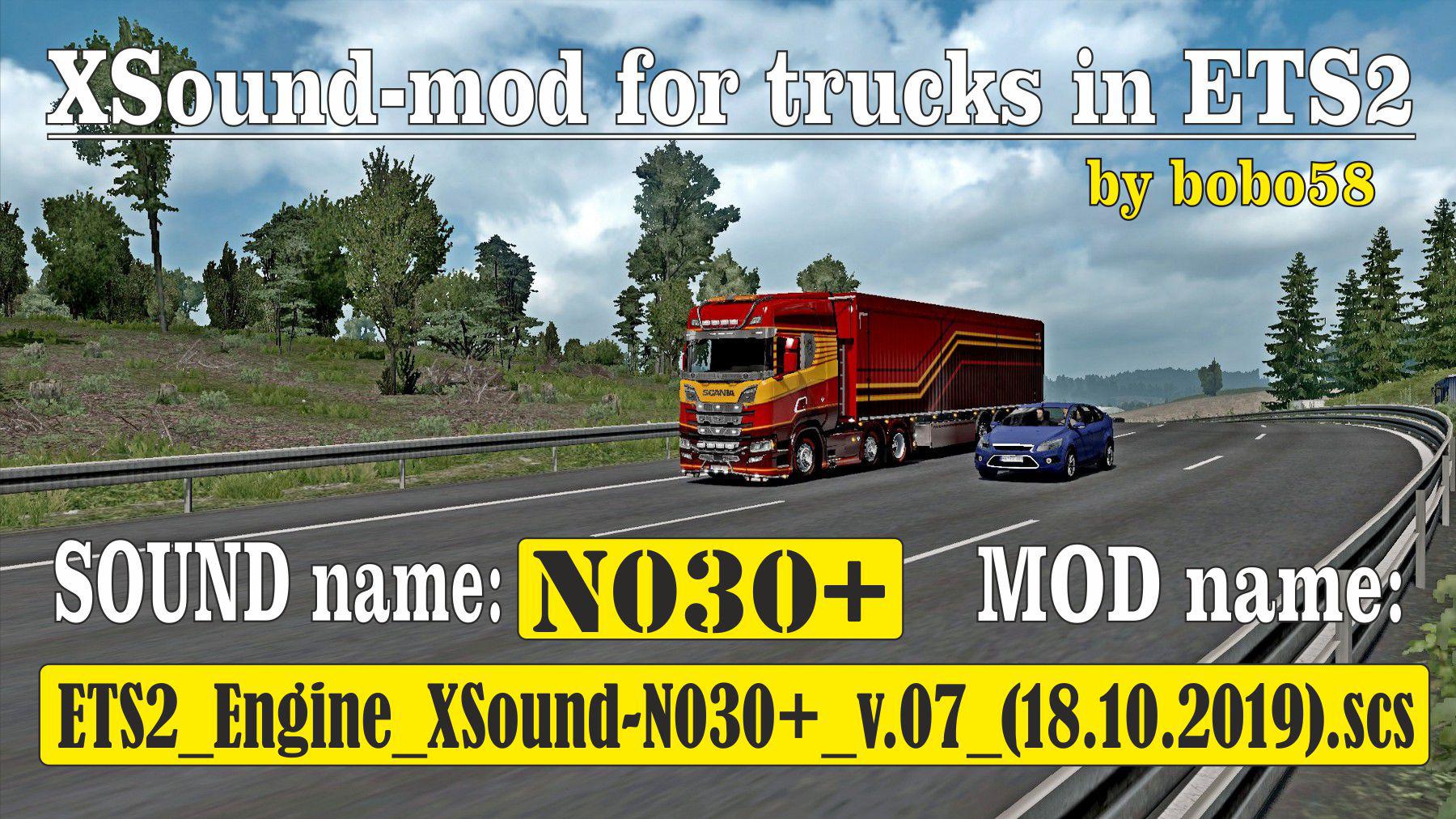 – -= Euro Truck Simulator 2 =- – Sound mod: -=( ETS2_K100E_XSound-N030_v.07_(18.10.2019).scs )=- This sound-mod changes the sound of any engines in Kenworth.K100E truck for ETS2.  Sound mod: -=( ETS2_Engine_XSound-N030+_v.07_(18.10.2019).scs )=- This sound-mod changes the sound of any engines in all SCS trucks forETS2.  List trucks (SCS) ETS2: – – – DAF.XF – – – DAF.XF_euro6 – – – Iveco.HIWAY – – – Iveco.STRALIS – – – MAN.TGX – – – MAN.TGX_euro6 – – – Mercedes.ACTROS – – – Mercedes.ACTROS 2014 – – – Renault.MAGNUM – – – Renault.PREMIUM – – – Renault.T Range – – – Scania.R – – – Scania.R_2016 – – – Scania.S_2016 – – – Scania.STREAMLINE – – – Volvo.FH16 – – – Volvo.FH16_2012 * * * * * * * * List other trucks: – – – DAF.95ATI – – – DAF.F241 – – – D3S Mercedes Antos ’12 – – – MAN.F2000 – – – MAN.TGX2010 – – – Scania.R4 – – – Scania.RS – – – Scania.T – – – Scania.T4 – – – Scania.G – – – Scania.P – – – Volvo.F88  ____ USER MANUAL____ ATTENTION! This mod do not change the game process. You can use sound mod at any time, it’s enough to leave the game and on/off or replace mod then continue the game. – – To work correctly, use any, but only one mod from this series.  by bobo58 / 18.10.2019