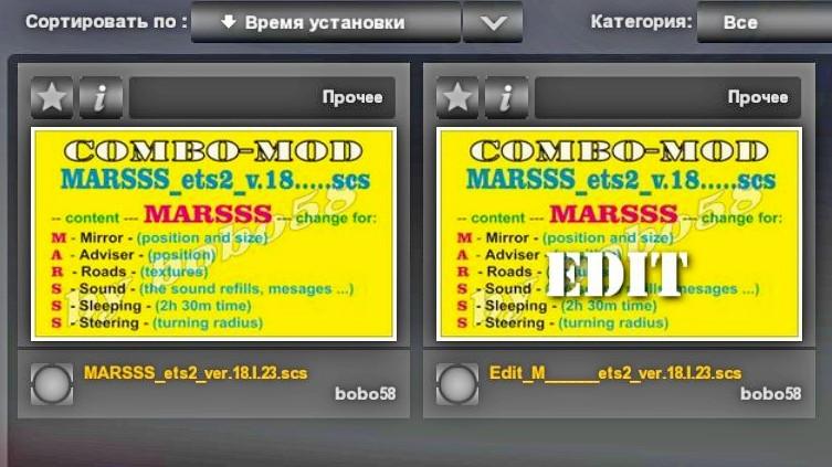 ATTENTION! You have the right not to use these mods and the delete them your out PC. You can freely distribute these mods on your behalf. _ _ _ = Euro Truck Simulator 2 ver.1.30.x =_ _ _ When creating this mod, were used parts of mods: _ FRKN64 – roads textures _ XEBEKzs – adviser and other mods, authors I do not know All in archiv – ETS2_combo-mod_ver.18.I.23.rar (~29mb) This COMBO-MOD – MARSSS_ets2_ver.18.I.23.scs contains changes for: —– MARSSS —— M – Mirror – (position and size) A – Adviser – (position) R – Roads – (textures) S – Sound – (the sound refills, mesages …) S – Sleeping – (2h 30m time) S – Steering – (turning radius) From a combo-mod it is possible (excluding M – mirror) to delete not necessary to you: A – adviser R – roads S – sound S – sleeping S – steering _ _ _ MANUAL _ _ _ Just run CMD-file: — #_edit_combo-mod.cmd and select unnecessary for delete (only for Win-x64, for Win-x32 – ???) CMD-file will create a new mod, with the name of the type: — Edit_Mxxxxx_ets2_ver.18.I.23.scs For work, the original mod: — MARSSS_ets2_ver.18.I.23.scs is needed next to the CMD-file. Credits: bobo58 Credits: bobo58 |