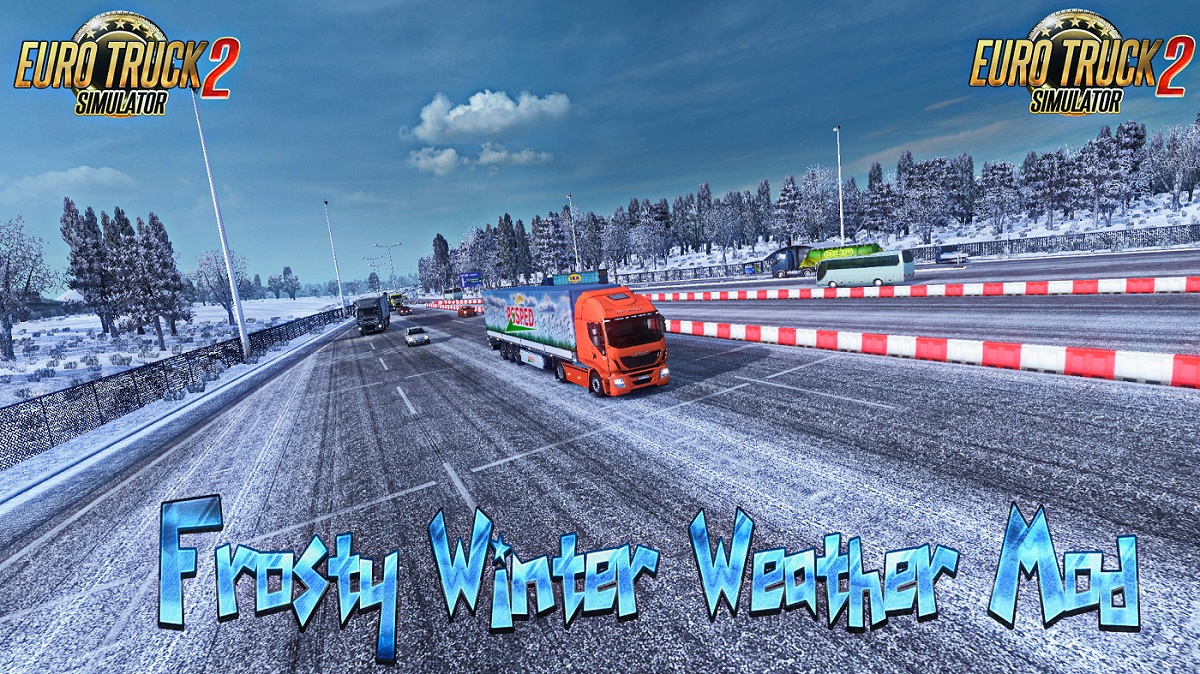 Frosty winter weather and environment Snow/Sleet instead of rain Winter daylight hours and temperatures Random cloudy, misty and sunny weather Old vegetation types replaced by new ones across maps Heavy Winter Addon and Physics in download* *Heavy Winter Addon provides snowy/slushy looking roads and a snow covered landscape with less grass. *Physics – Makes the roads a little more slippy Works with Promods, TSM, MHA, Rus Map and others, compatible with all map DLCs. Place Frosty above Realistic Building Lights mod. Place Frosty above Drive Safely’s Sound Fixes Pack to remove summer sounds like insect noises. Compatibility Latest Game Version: 1.32.x Changes in v6.8 - Missing sky texture issues fixed New Changes in v6.7: -Updated for 1.32.x game version -Frosty Roads added to default version -Improved weather -Updated for maps Recommended Settings HDR: Enabled Color Correction: Enabled Vegetation Detail: High Grass Density: High Important!! Please disable other weather, natural lighting, HDR and environmental graphics mods or you may experience issues, conflicts and crashes.Frosty should be placed on top in Mod Manager. Bonus [INCLUDED]: Heavy Winter Addon v6.8 for 1.32: - Adds snowy roads and landscape, place above Frosty Physics v6.8 for 1.32: - Makes the roads a little more slippery Credits: Grimes |