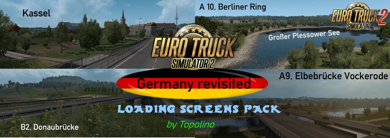This mod replaces the SCS loading screens with new ones from the rebuilt German area. Place it above map mods which change UI. Features: - 40 unique screenshots of the reworked Germany as loading screens (at least one of each city plus Bundesstraßen and Autobahnen) - 3 screenshots as loading screens when taking ferries - Logo and corners while loading changed Changelog in v1.0: - Release Credits: Topolino |