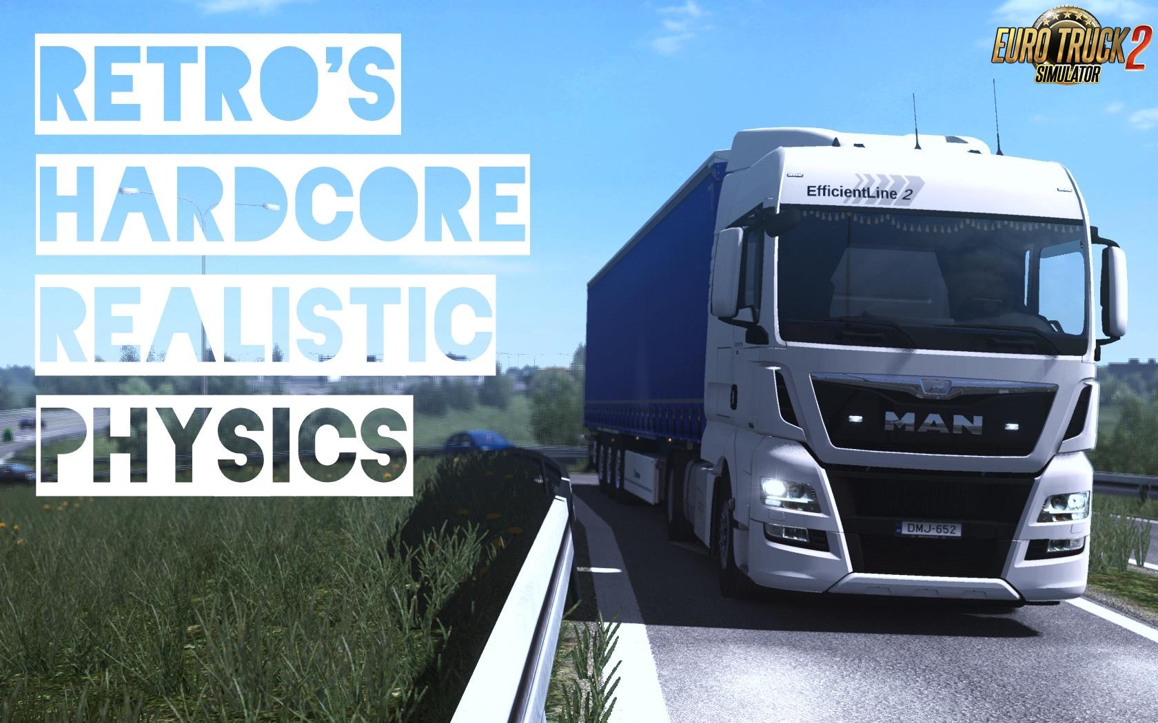 This is a hardcore realistic physics mod designed for users who are looking for a realism.Also, the mod changes interior camera behavior. For the proper mod work you will have to do some changes. I've adapted all default truck chassis files so you will need to do the same thing for modded trucks (in the future updates I'll adapt chassis files for modded trucks you request) So, how to do it? For example I want to adapt MADster's MAN TGX Euro 6... You open the truck mod and follow this path: man_tgx_euro6_byMADster_v2.1.scs\def\vehicle\truck\man.tgx_euro6\chassis\4x2.sii You open this .sii file and change default values to these residual_travel[]: 0.30 # 1st axle residual_travel[]: 0.10 # 2nd axle kerb_weight[0]: 5000.1 kerb_weight[1]: 2000.1 For now, the mod is only suitable for 4x2 chassis. In one of the next updates I'll make one more additional mod for 4x2 lowdeck chassis, because if you change residual travel of an axle the whole truck behaves differently. Next thing you need to change is trailer stability. Decrease trailer stability all the way to the left, to the minimum. Braking intensity should be at the middle if you use keyboard, but for the steering wheel users I recommend to try it out and see how it feels, how it's more comfortable for you. Physical camera movement factor to the maximum. You are done! That's it! There is one known bug. If you brake really hard with an empty trailer or a low weight cargo cabin tends to sink forward and it doesn't go back to the neutral position how it should. I hope you don't mind this and this will be fixed in the next update. I've tried doing everything but to fix this problem I have to change the whole way of making cabin realistic movement, so this will be done next time I update the mod. Credits: retro |
