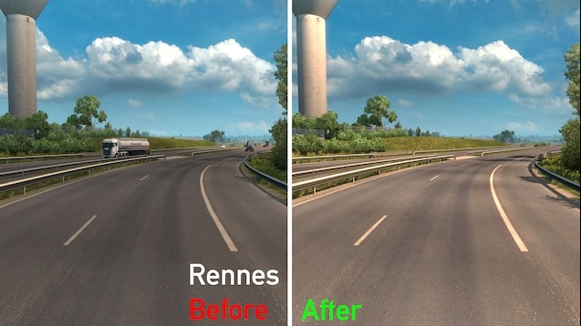 This mod replaces the roads in France, Scandinavia, Italy, Baltics and the reworked parts of Germany with very high-resolution versions so that every road line you see are smooth, unlike the occasional curve that is made of up straight-line segments in the stock map. This mod only replaces the road templates used in-game and does not modify the map. Changelog v1.3.1 1.45 -Made mod optional in convoy -fixed bugs -adapted for latest patch 1.45 Credits: Oscar Credits: Oscar |