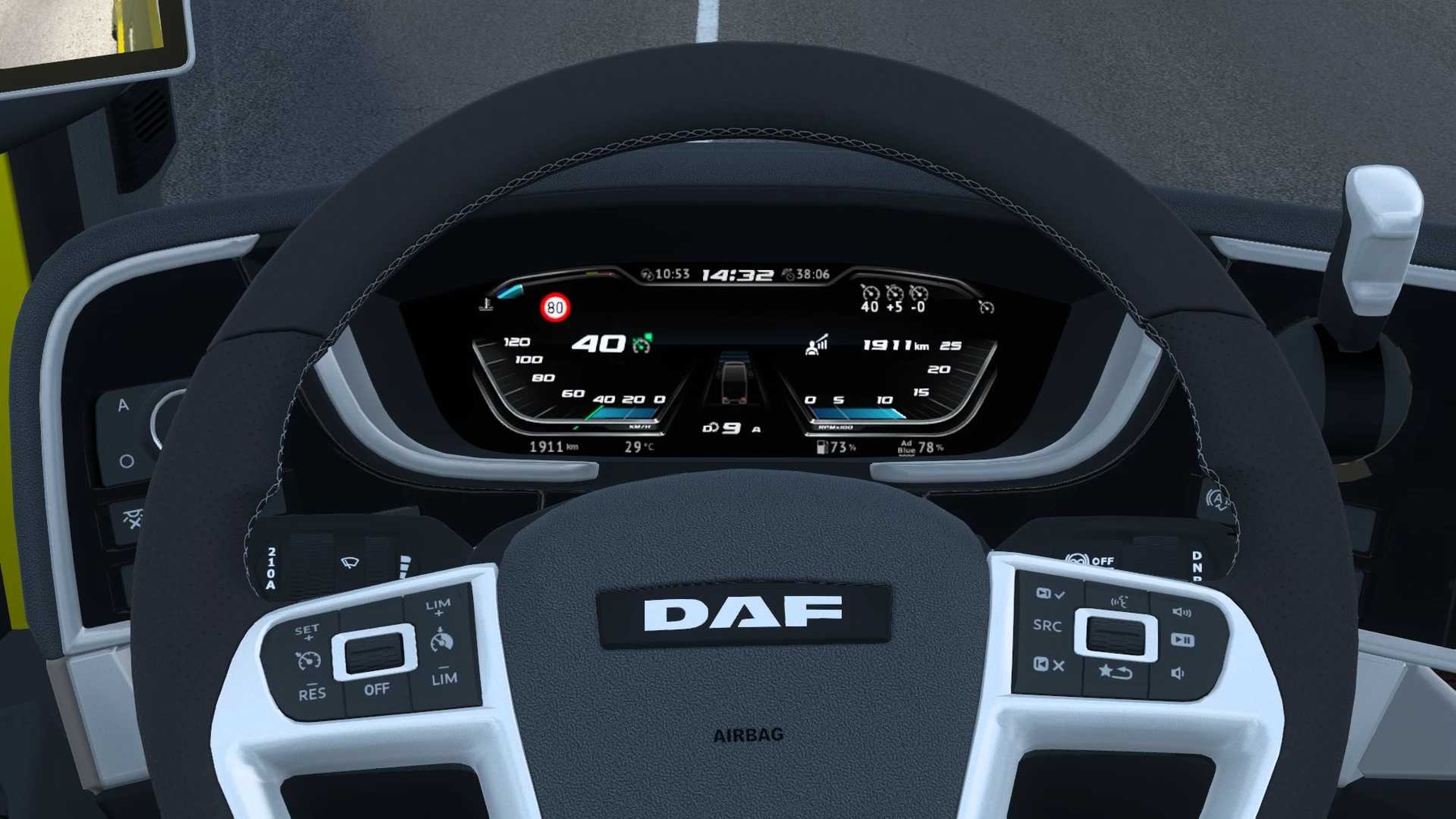 This modification adds quality and makes the dashboard of the New Genration DAF 2021 XG & XG+ more realistic. Due the game engine limitation, speed indicator show wrong speed when reach 120Km/h. (Recommended for those who use speed limiter and never achieve that speed) Visual changes: – Improved dashboard text size – Improved dashboard symbols (avg. fuel, inst. fuel, etc.) – Added some visual elements (speed limit indicator, refill in about, etc) – High Quality edges (EU & UK version) – High Quality Main Symbols (EU & UK version) – Added missing indicator for speed (EU version) – Added missing indicator for RPM (EU & UK version) Known issues: – Speed indicator indicate 110 KM/h when reach 120 KM/h on gauge. Changelog V2.1.2: – Added compatibility for 1.43.x game version – Fixed missing gear indicator – Adjusted font dimension for gear indicator Patch compatibility: 1.43.x; Older versions; Connection order: Any order! Doesn’t create incompatibilities! Mod compatibility: New Generation DAF 2021 XG & XG+ Credits: TheTiger |