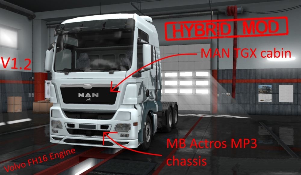 Hi everyone, The “Hybrid mod” add some modified trucks in Volvo, Iveco, Daf, Man and Mercedes truck dealers, with mixed chassis, mixed engines, mixed sounds and interiors. If you find any bug please report it to me. Known issues: *Some 3D models doesn’t fit well the cabin/chassis, for exemple on the Daf with the actros MP4 chassis and on the Volvo with an other MP4 chassis. *Trucks won’t appear in dealers if a Scout mod or based car mod is activated Tested on game version 1.31 and might not work on previous versions. Not tested on 1.32. Thanks for testing and have fun! Version: 1.2 -Changes on version 1.1: *Added to each modified truck the steering wheel corresponding to the engine used. *Fixed bug with Volvo and Daf with MP4 8×4 chassis when you customize these trucks the interior automatically change -Changes on version 1.2: *Fixed bug where the steering wheel wasn’t there on the Daf XF *Fixed doorsteps that doesn’t fit the chassis Credits : SCS, Hyzonn (Jayson) Credits: Jayson (Hyzonn), SCS Credits: Jayson (Hyzonn) |