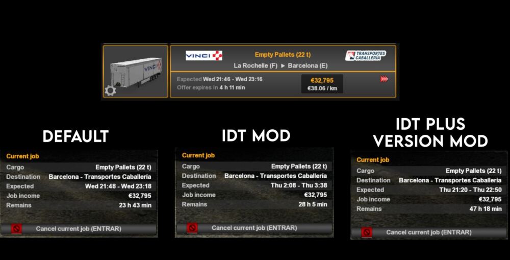 – Compatibility Update for 1.47 version ——————- This is an expanded version with respect to the standard version, it will have more time available to make deliveries Features – This mod extends the timeframe for deliveries (the parameter “simulation_avg_speed” has been reduced from 62 to 30) *Note: Workers will take longer time to deliver. If this is important to you, I recommend the “Standard” version or not to use this mod If you have an active order, the extratime will not work until the next job! Compatibility – This mod may be affected if you use another Economy Mod, don’t use it! – Not tested with World of trucks Jobs Credits: SCS, Darkcaptain Credits: Darkcaptain |