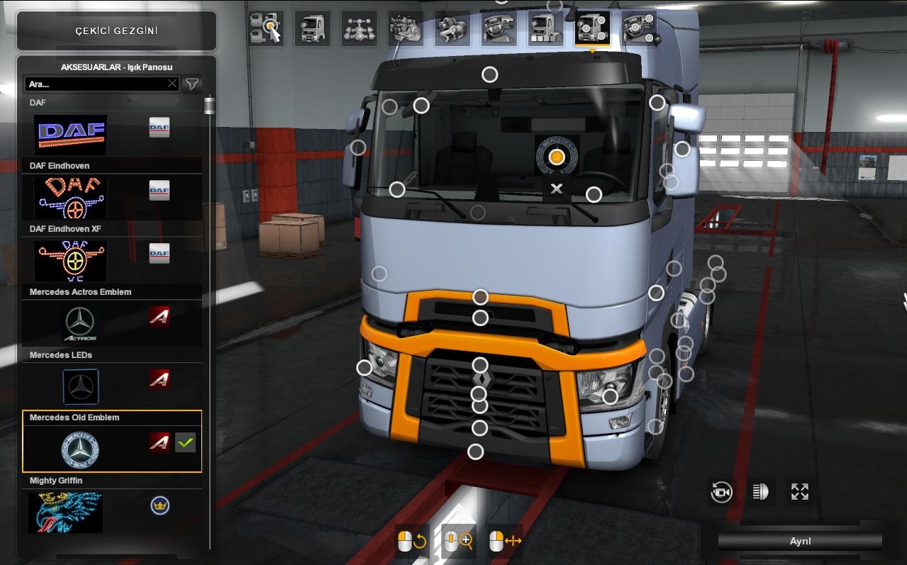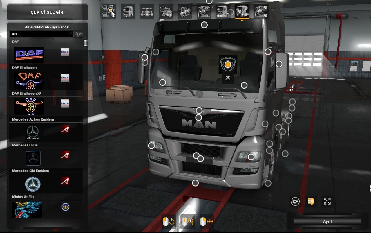 [EN] Hello, you can add interior lighting to your truck with this mods. Author(Credit): @mexiumut Supported Version: 1.36.x and higher NOTE: Ignore all warnings and force the game to continue. NOTE2: Actros Tuning Pack, Mighty Griffin Pack and XF Tuning Pack is required. Installation: -Download the file below. -After that, move the SCS files to My Documents > Euro Truck Simulator 2 > mod. -Run Euro Truck Simulator 2 (SP) via Steam. -On the profile selection screen, click Mods Manager. -Double click on the Tum Cekicilerde isik Panosunu Kullanma Modu -Click the Submit Changes button. -Log in to your profile. -Go to Service -In the main menu click exit. -Close it SP and switch to MP. -Click the “Continue” button. -Log in Multiplayer and select your profile, If he says anything to you Continue button click. [TR] Merhaba, Bu mod Actros Tuning Pack, Mighty Griffin Tuning Pack ve XF Tuning Pack paketlerinde olan ışık panolarını diğer tüm çekicilerde kullanmanızı sağlar. Yapımcı: @mexiumut Desteklenen Sürüm: 1.36.x ve üstü NOT: Profilinizi yüklerken gelen uyarıları yok sayın ve devam edin. NOT2: Actros Tuning Pack, Mighty Griffin Pack ve XF Tuning Pack gereklidir. Kurulum: -Yukarıdaki adresten modu indirin. -İndirmiş olduğunuz .scs dosyasını Belgeler > Euro Truck Simulator 2 > Mod klasörünün içine sürükleyin. -Steam üzerinden Euro Truck Simulator 2 (SP) başlatın. -Profil seçme ekranından Mod Yöneticisi’ne tıklayın. -Tüm Çekiciler İçin Işık Panosu moduna çift tıklayın ve modu aktifleştirin. -Değişiklikleri Onayla butonuna tıklayın. -Profilinize girin, Servise gidin ve parçalar bölümünden istediğiniz ışık panosunu takın. -SP kapatıp MP geçin. -MP’a girdikten sonra karşınıza bir uyarı gelirse Devam Et butonuna tıklayın. Credits: mexiumut Credits: mexiumut |