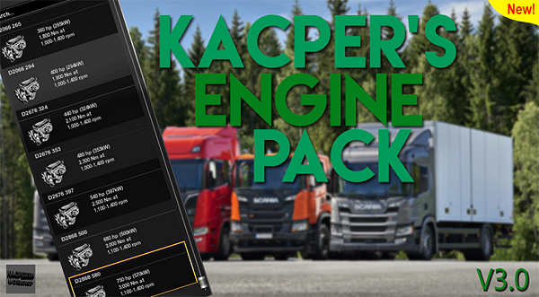 Kacper’s Engine Pack Addon for Euro Truck Simulator 2 & American Truck Simulator This is a big engine pack with over 60 different trucks supported, Most of the trucks are for Euro Truck but soon the addon will recieve more engine and more truck support for American Truck. It features high powered engines and lower powered engines which are a regular price and a regular unlock level. Sound is supported too, Stock sound and Custom sound are included in this addon. New in V3.0 ————————– -Iveco Eurostar Support (Added + Modified Engines) -New Sound + Engine for the Scania 4 -New Sound For Man TGA -New Sound + Engine for the New Scania S + R -Fixed bugs with the man TGA -Removed Loading Screens -Fixed a few bugs -Fully Redesigned Addon Image -All chassis should now be as default -Added new Engines for other Trucks ________________________________________________________ What’s in the New Edition? ——————————– This edition recieved a lot of new engines, truck supports and sounds. The New Edition comes with the 3.0 update and doesn’t require any mods, the trucks supported are “optional” so you don’t have to download them if you don’t want to. This modification is compatible with all your favourite trucks, Every update new trucks are being added and bugs are getting fixed. If you like an engine mod which is realistic then you should try this out. To make the addon work at its best you’ll have to give the mod a high priority, mainly over trucks and sounds. Load Order ———- This mod has its own special load order due to overwriting done to the def files, This mod has to go on “TOP” of all your favourite “TRUCKS” or else the mod will not function properly. EXAMPLE : Some things like badges, Sound and even engines could be missing. © Kacperth Workshop 2018, All rights reserved Credits: Kacperth Workshop, Zeeuk1, Rupert Smith, Kriechbaum, EVR, 50Keda, SCS Software Credits: Kacperth Workshop |