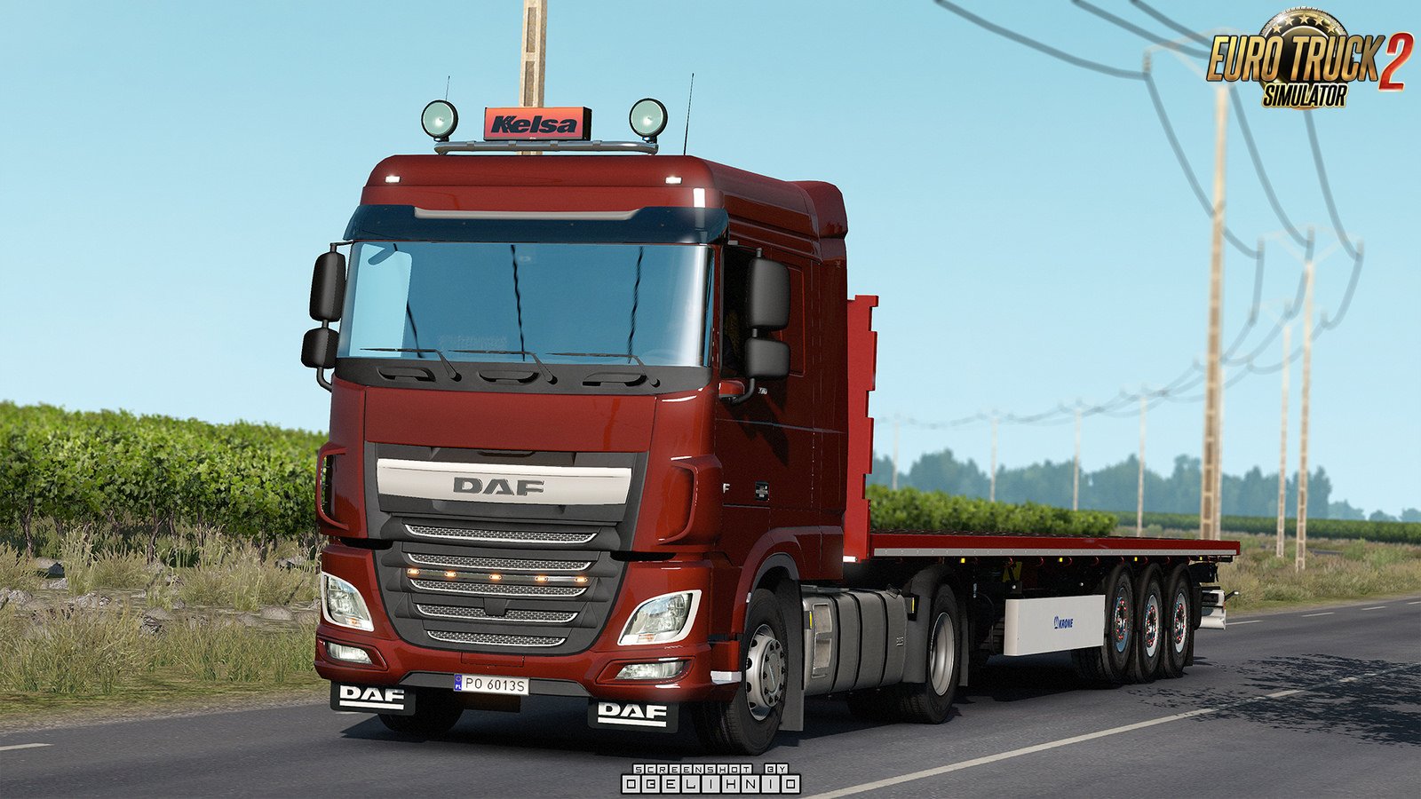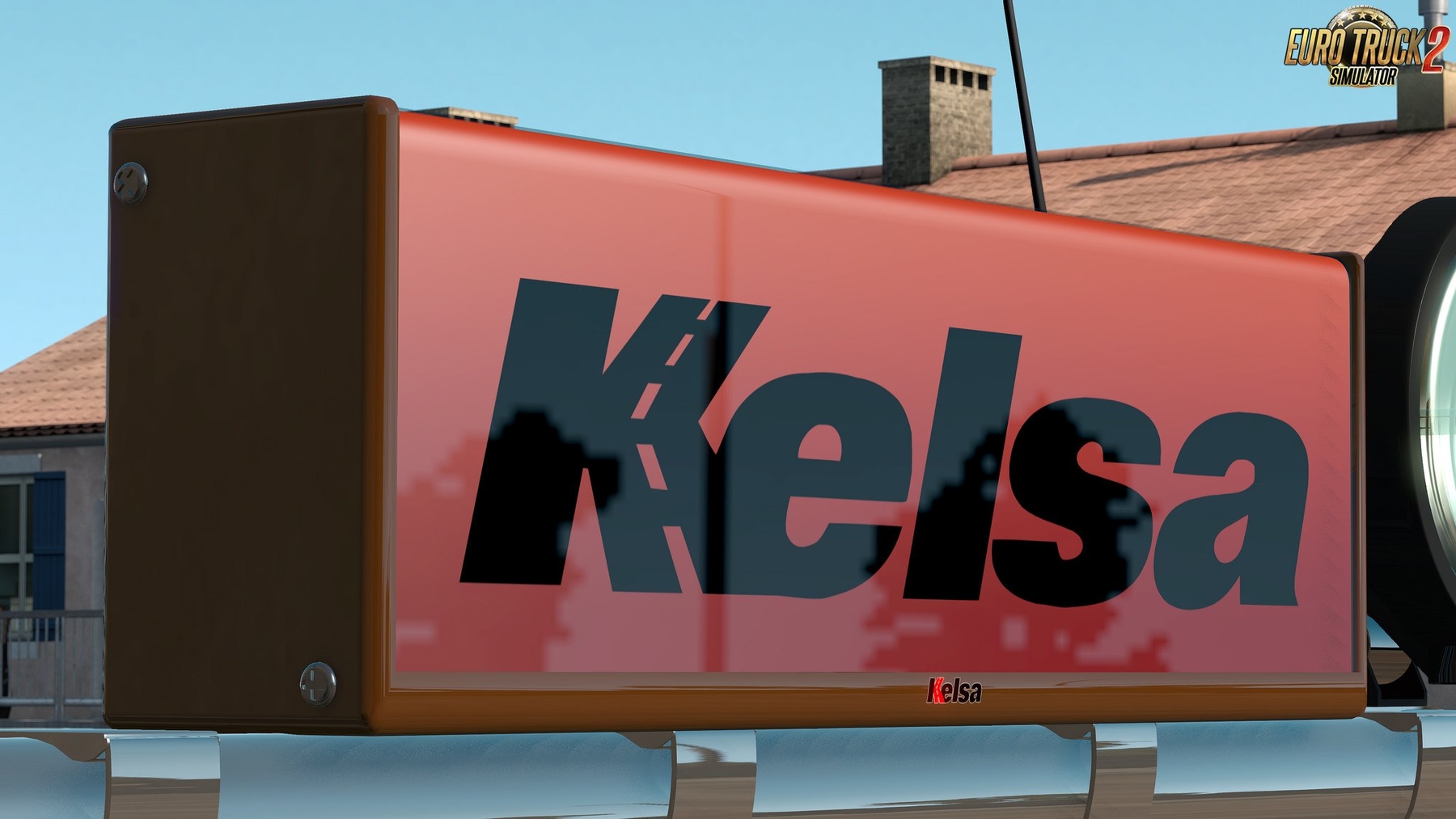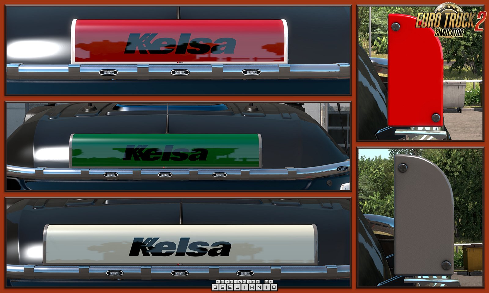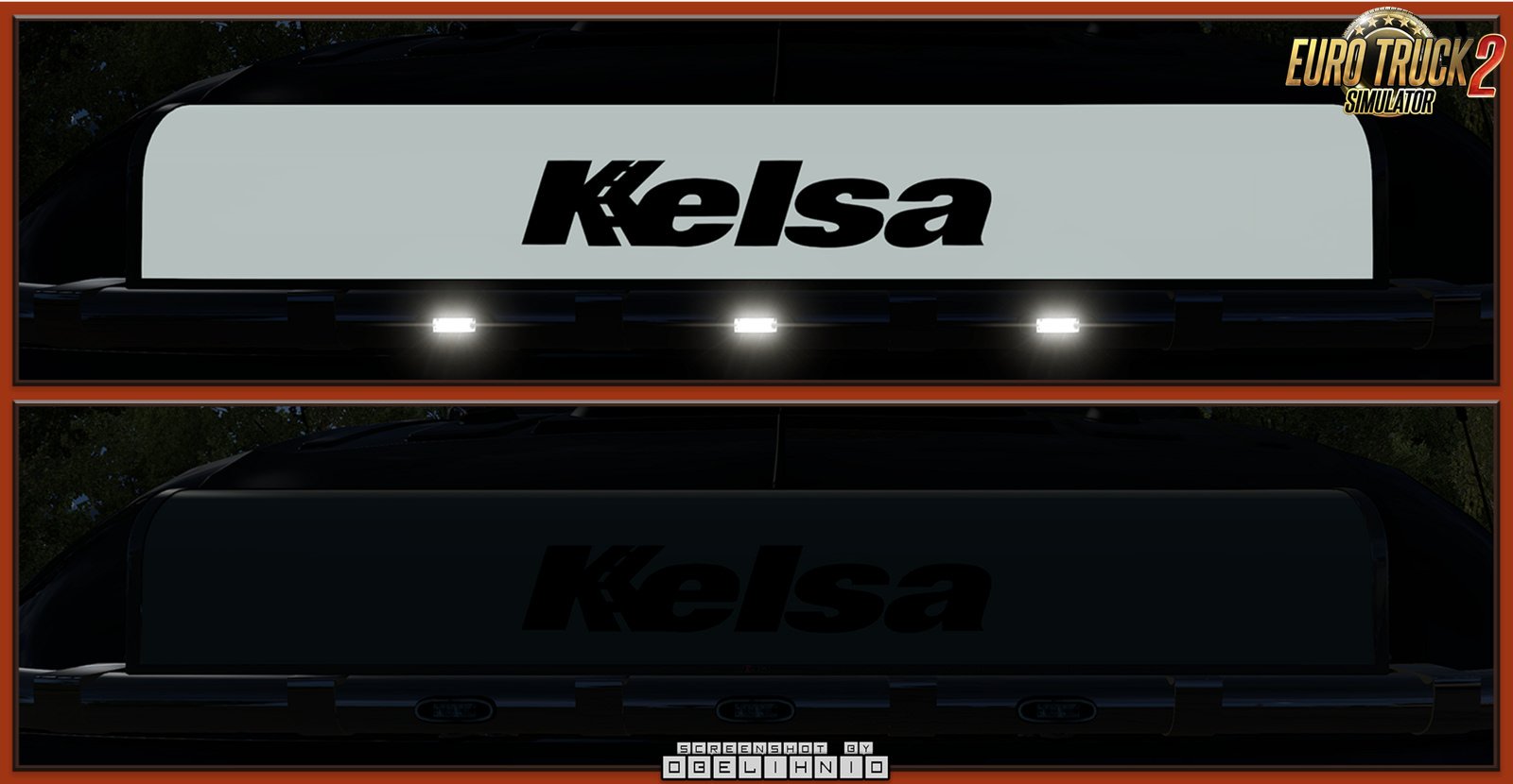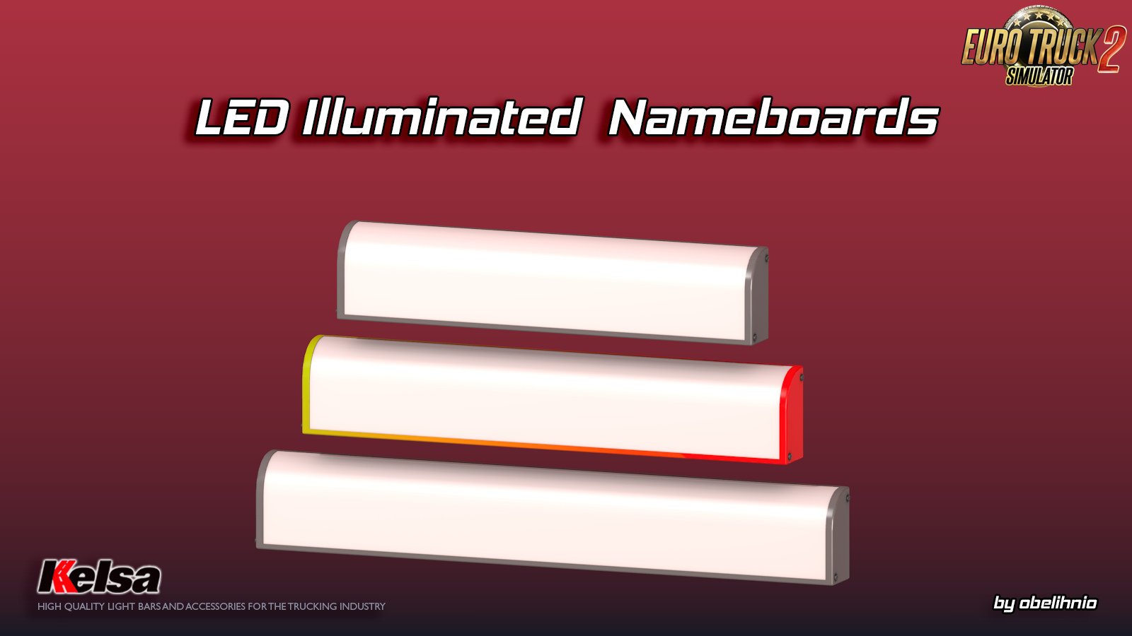 This mod adds a small set of Kelsa box type LED nameboards. These require a centred slot on the roof light bars. Models are completely stand-alone otherwise. New version 1.1: - added a new model to the pack and tweak sizes of the existing models a little bit. Features: - Fully stand-alone, only requires a slot on the light-bar - Slanted type - 3 width options: 900mm, 1050mm, 1250mm. Each size has a separate texture to appply the logo - Rectangle type - 650mm wide - Metal and painted body variant IMPORTANT!: The painted body option is NOT USING the truck colour. Use the included template to paint the box. [Main Mod] Credits: obelihnio |