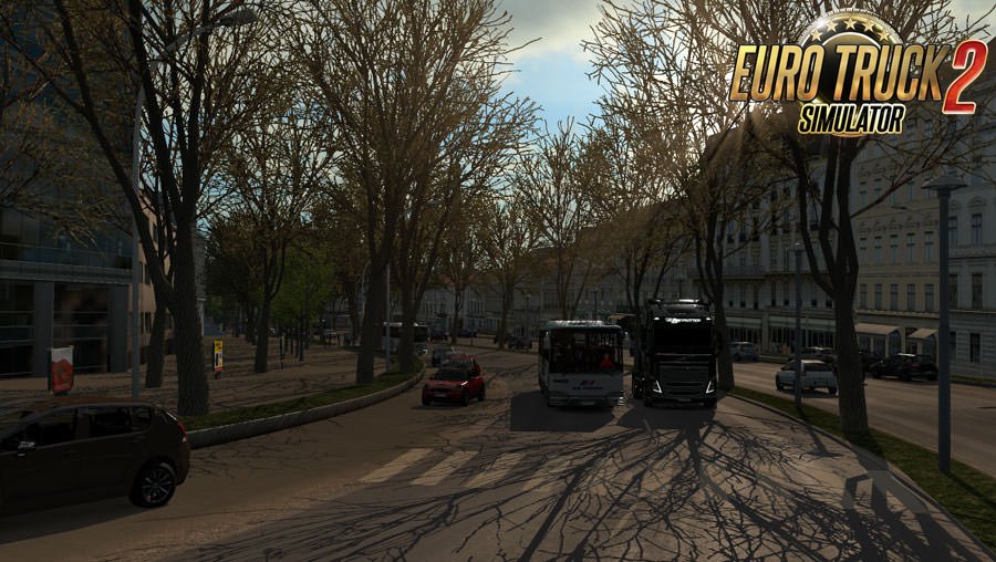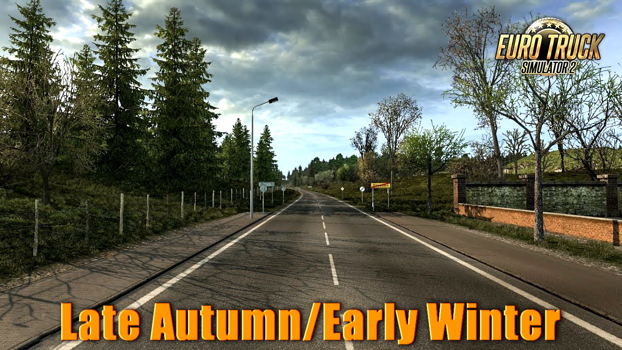 This mod simulates late autumn/early winter weather and environment and replaces older textures with higher res versions. Features Random grey sky, misty and sunny weather Old vegetation types replaced by new ones across maps Old roads, fields and grass replaced with higher res versions Improved rain and wheel spray No thunder or lightning Leafless vegetation HDR Bloom reduced Late Autumn/Early Winter daylight hours Appropriate temperature readings No harvesters Compatibility latest version: 1.33 Works with Promods, Rusmap, TSM, MHA and many others. Compatible with all map DLCs. Changes in 3.2 Updated for 1.33 & Baltic DLC Vegetation improvements Place Late Autumn/Early Winter above sound mods in Mod Manager to remove summer sounds like insect noises. Recommended settings HDR: Enabled Vegetation Detail: High Grass Density: High Important!! Late Autumn/Early Winter is a weather and graphics mod so other graphics, weather and HDR mods should be disabled to avoid conflicts, issues and crashes. If you are using Next-Gen then only use the base part of that mod. Late Autumn/Early Winter should be given a HIGH priority in Mod Manager. Credits: Grimes Credits: Grimes |