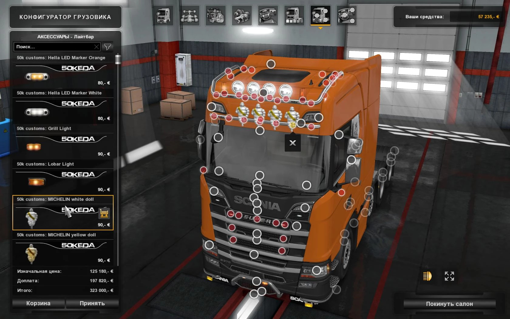 Changelog Update for 1.41 Finally the moment of recovery has come. 50k Customs is renewing their legendary 50k addons mod: -Light Board (1.) -Plate Light Board (1.) -Michelin Dolls (yellow and white) (1.) -Hella Chromium (2.) -Hella Chromium Angel Eyes (2.) -Hella Lollipop (1.) -Fog Light (1.) -Custom Beacon -Grill Light with custom flares and light (1.) -Low Bar Light wit custom flares and light (1.) Credits: 50keda |