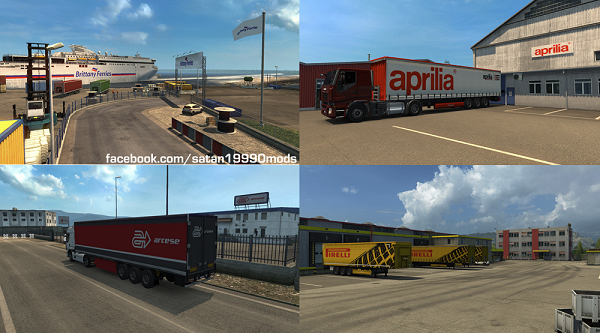 Mod changing company logos and trailer skins for painting real companies. Now mod changing 56 companies Mod tested and working on v1.30 Changes in v2.7 – Changes in companies French DLC *) Eco – Elf *) Gallia Ferries – Brittany Ferries *) Kaarfor – Carrefour Italy DLC *) Libellula – Aprilia *) AA – Auto di Alonso – Fiat *) Spinelli – Pirelli *) Te_logistica – Arcese *) Terminal Container – Grimaldi Group *) Eolo Lines – European Seaways *) Cesare Supermercato – Conad *) Ini – Eni – Changes in ship models – Changes in company signs – Changes in gas station models – Fixed errors and warnings – Many, many others small changes. Credits: satan19990 Credits: satan19990 |