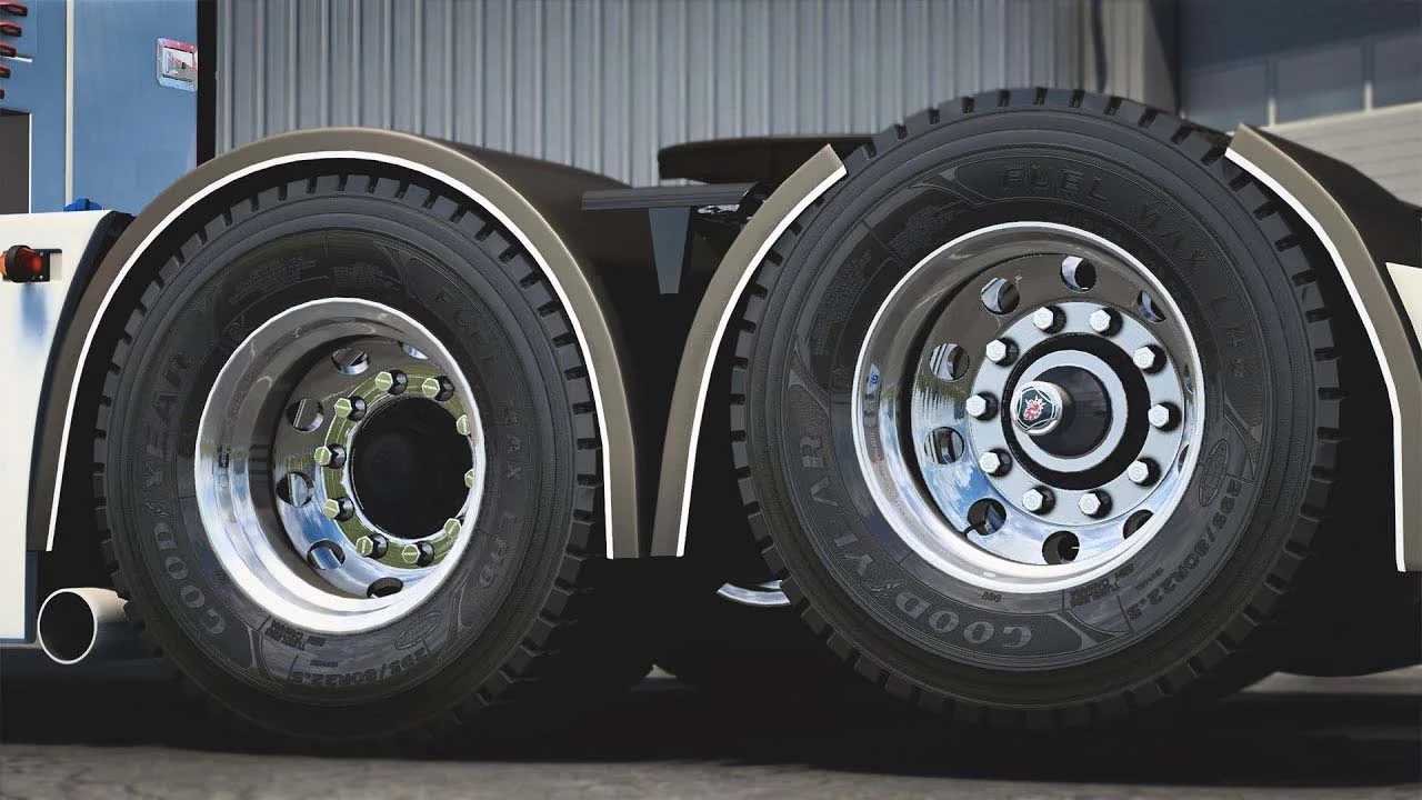 Wheel Model: ItalSpeed GT 1 – 3 rear and front variants with plus 3 types of textures, clean, dirty, and dusty. Alcoa LvL ONE – 3 rear and front variants plus 4 variants: Standard, polished, urban dirt, and dust. Steel 22.5×8.25 – 4 rear and front variants. Alcoa Ultra ONE – 2 rear and front variants: Standard, polished. Hubs: Scania 5 series front hubs with 3 variants. Rear Scania hubs DAF front and rear hubs with some variants. Auxiliary Hub with variants. Tyres: Good Year Max Fuel LHS and LHD. With 4 variants: Standard, polished, urban dirt, and dust. Adapted for ETS2 1.47 Credits: LS 3DWorks |