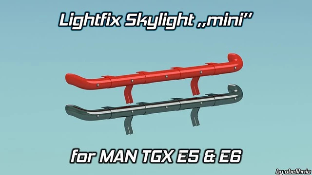 What is this? Mod adds a Lightfix Skylight (model 21701-1) bar from MAN Trucks with 4 lamp slots, features chrome and painted look. Bar has a stock mounted LED lights by abasstreppas. The painted version uses the truckpaint shader now, same as my Kelsa mods. Changelog v1.3 Update for 1.42 obelihnio: definitions, 3d model, icons abasstreppas: LED lights + flare, decals Credits: obelihnio |