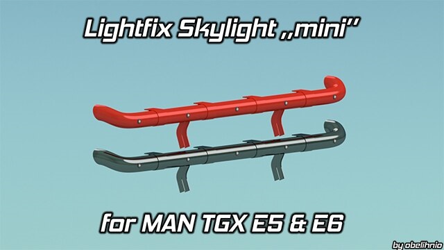 Changelog v1.4: Support for 1.43 game version. Game version:[1.40.*]-[1.43.*] Mod adds a Lightfix Skylight "mini" (model 21701-1) bar for MAN Trucks with 4 lamp slots, features chrome and painted look. Bar has a stock mounted LED lights by abasstreppas. The painted version uses the truckpaint shader now, same as my Kelsa mods. To paint it in a specific colour use the template below(advanced). Credits: Obelihnio |