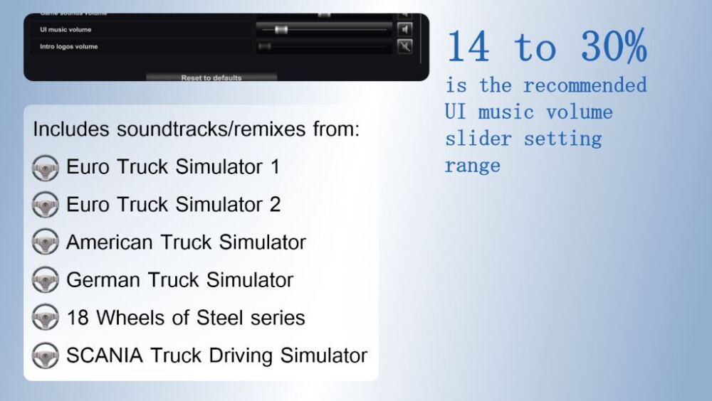 New in this version: New soundtracks + fixed the issue where the music would stop after customizing your truck for a long time. Looking for a variety of nostalgic and new music for the game? This mod includes: – 10 main menu music tracks – 2 delivery finished music tracks – 1 cutscene music track – 1 truck upgrade music track comprising of several music themes into one seamless track The music includes original soundtracks from SCS Software titles and/or remixed versions of them from the following games: – Euro Truck Simulator 1 – Euro Truck Simulator 2 – American Truck Simulator – German Truck Simulator – SCANIA Truck Driving Simulator – 18 Wheels of Steel series The mod was tested on 1.46 but should run on all future versions. Happy trucking! # Credits * SCS Software for the music * Drive Safely for remixing the music Credits: SCS Software, Drive Safely Credits: Drive Safely |