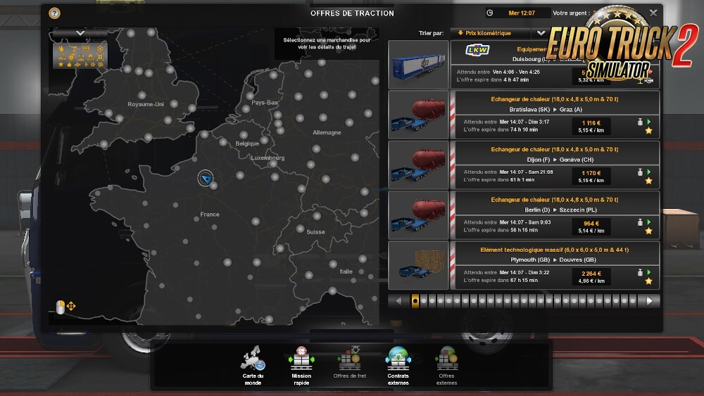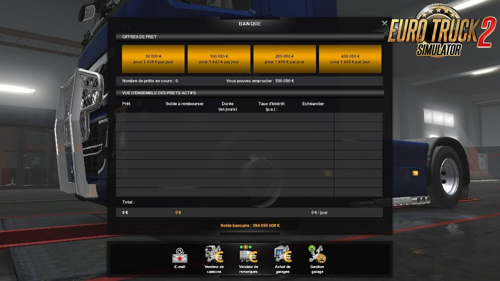 With this mod you have more realism in Ets2 game The mod is compatible with 1.36.x game version New profile not required. You can activate your mod on all the profiles you want New Version 12: - Update of fuel prices. - Durations of loans divied per 10. - Loans more expensive. - You start the game with 16.000€. - Prices of selling of trucks on 50% of their initial prices. - Prices of the garages reduced of 30%. 1) Available on-line purchase without buying a truck. 2) Improvement of the sound of the rain and of the thunder (thanks to American-Express). 3) Fee of hiring: 1 083€. 4) Increase of the number of kilometers in the capacities of long distance. 5) Correction of data on certain engines (thanks to MichelP). 6) Starting up of the game at 6 am in the morning with 16.000€. 7) Decrease of the duration of the hurry up music to 10 minutes. 8) Decrease of the number of XP gained during a stroll (10 XP every 100 kilometers). 9) Decrease of the number of XP gained during a mission (10 XP every 100 kilometers). 10) Decrease of the number of XP gained when you drive on an undiscoevred road (20 XP every 100 kilometers). 11) Decrease of the number of XP won during a putting alongside the quay. 12) Decrease of the number of XP lost for late. 13) Decrease of the maximal loan. 14) Duration of authorized overdraft crossed in 30 days. 15) Longer durations of refund. 16) Expenses of abandonment of a trailer reduced to 1 200€. 17) Expenses of the drivers are more realistic. 18) More realistic times of rises of sun and night. 19) Modification complete of system of points of experience. 20) Modification of a part of icons (thanks to James Le Bavard). 21) Modification of the sum of the loans. 22) Modification of the parameters of the camera. 23) Opacity of the night increased to 100%. 24) Loss of XP on a trailer decreased to 1 XP by % of damages and to 1 % by % of damages. 25) Loss of the money on a trailer decreased in 10€ by % of damages and in 1 % by % of damages. 26) Possibility of making loans without any mission made. 27) Prices of accessories decreased in 90% on average so they are more realistic (even those of ALL THE DLCs excluded Flags DLC which is realistic). 28) Price of the fines fixed according to the French regulations. 29) More realistic quick cargo prices. 30) More realistic cargo prices. 31) More realistic cargo prices in traction offer. 32) Prices of the garages reduced of 30%. 33) Realistic prices of the fuel in all the countries (15th April 2020). 34) Reduction of the consumption of the drivers in the kilometer, between 0,2 and 0,3 liters. 35) Reduction of the probability that a driver has no trailer to 0%. 36) Reduction of the maximal damages caused on a trailer by a driver to 1%. 37) Reduction of 20% of the price of the diesel oil in garages. 38) Reductions of the deadlines of delay (8 hours for the non-urgent deliveries, 4 hours for the normal and the 1 hour for the urgent against 2 days, 12 hours and 4 hours). 39) Occasions of trucks in 50% of their initial prices. 40) Interest rate of the loans reduced to 5%. 41) Exchange rate realistic (13th January 2020). 42) Time of rest modified (11 hours of break every 9 hours of driving). 43) Reduction of the price of the refueling by the tow truck. Note from the Author: This modification contains more than 3.000 files which were modified by myself! Tested on 1.36.x game version Credits: Ficfic & thanks to Hugo Coytte, James LeBavard, MichelP, American-Express, and Dk Credits: Ficfic |