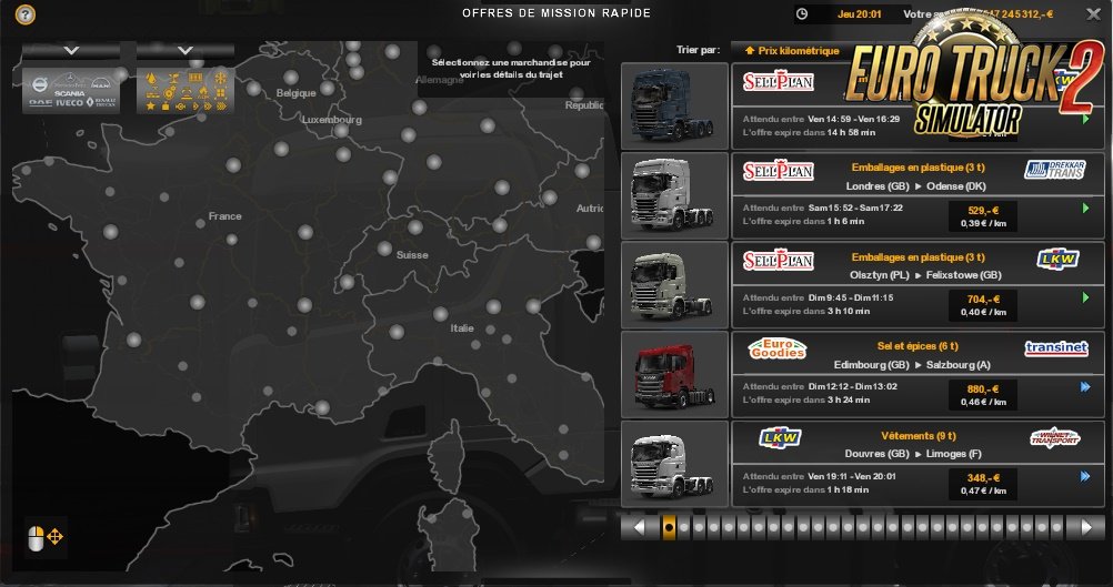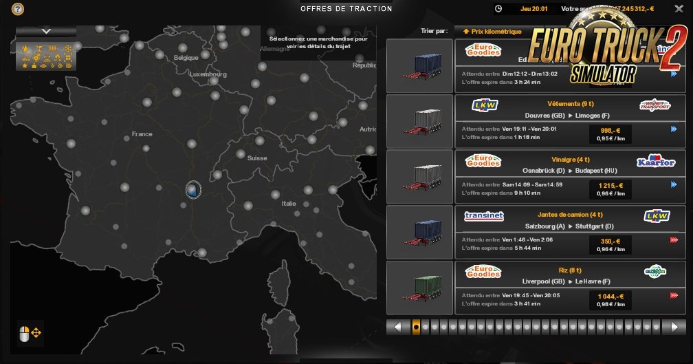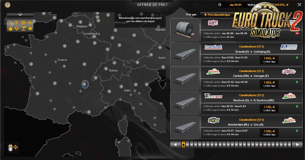 With Realism v9 you have: 1) Available on-line purchase without buying of truck. 2) Improvement of the sound of the rain and of the thunder (thanks to American-Express). 3) Fee of hiring: 1 083€. 4) Increase of the speed of all the AI vehicles. 5) Increase of the number of kilometers in the capacities of long distance. 6) Correction of data on certain engines (thanks to MichelP). 7) Starting up of the game at 6 am in the morning with 176 000€. 8) Decrease of the duration of the hurry up music to 10 minutes. 9) Decrease of the number of XP gained during a stroll (10 XP every 100 kilometers). 10) Decrease of the number of XP gained during a mission (10 XP every 100 kilometers). 11) Decrease of the number of XP gained when you drive on an undiscoevred road (20 XP every 100 kilometers). 12) Decrease of the number of XP won during a putting alongside the quay. 13) Decrease of the number of XP lost for late. 14) Decrease of the maximal loan. 15) Duration of authorized overdraft crossed in 30 days. 16) Much longer durations of refund. 17) Expenses of abandonment of a trailer reduced to 1 200€. 18) Expenses of the drivers are more realistic. 19) More realistic times of rises of sun and night. 20) Modification complete of system of points of experience. 21) Modification of a part of icons (thanks to James Le Bavard). 22) Modification of the sum of the loans. 23) Modification of the parameters of the camera. 24) Opacity of the night increased to 100%. 25) Loss of XP on a trailer decreased to 1 XP by % of damages and to 1 % by % of damages. 26) Loss of the money on a trailer decreased in 10€ by % of damages and in 1 % by % of damages. 27) Possibility of making loans without any mission made. 28) Prices of accessories decreased in 90% on average so they are more realistic (even those of ALL THE DLCs excluded Flags DLC which is realistic). 29) Price of the fines fixed according to the French regulations. 30) More realistic quick cargo prices. 31) More realistic cargo prices. 32) More realistic cargo prices in traction offer. 33) Price of the reduced garages of 90%. 34) Realistic price of the fuel in all the countries (17th June 2019). 35) Reduction of the consumption of the drivers in the kilometer, between 0,2 and 0,3 liters. 36) Reduction of the probability that a driver has no trailer to 0%. 37) Reduction of the maximal damages caused on a trailer by a driver to 1%. 38) Reduction of 20% of the price of the diesel oil in garages. 39) Reductions of the deadlines of delay (8 hours for the non-urgent deliveries, 4 hours for the normal and the 1 hour for the urgent against 2 days, 12 hours and 4 hours). 40) Occasions of trucks in 75% of their initial prices. 41) Interest rate of the loans reduced to 5%. 42) Exchange rate of the realistic currencies (18th June 2019). 43) Time of rest modified (11 hours of break every 9 hours of driving). 44) Reduction of the price of the refueling by the tow truck. PS: This modification contains 3 931 files which were modified by myself! *you can activate your mod on all the profiles you want Tested on 1.35.x game version. Credits: Ficfic |