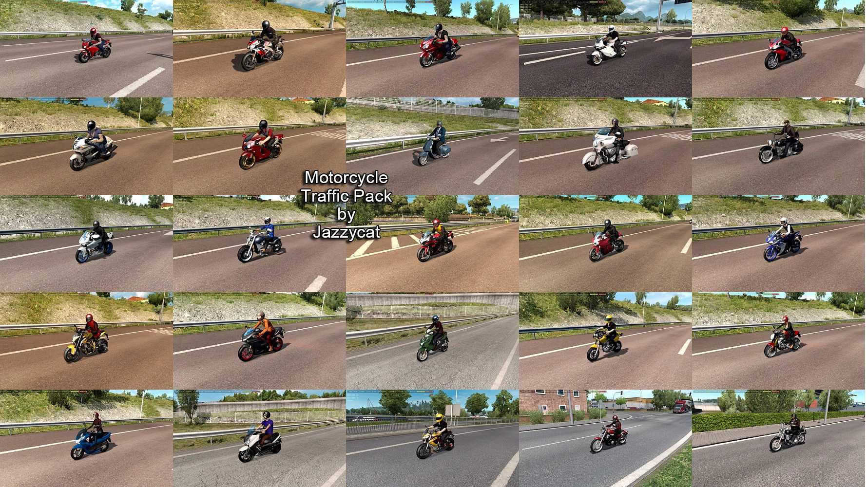 Pack adds in traffic 94 motorcycles: BMW S1000RR(’09, ’15), K1200S, HP2 Honda CB600 Hornet, CB500, CBR250R, CBR1000RR, Shadow RS, CB750F, XR125, CBR650R, PCX, Gold Wing GL, Shadow Phantom, CMX500 Rebel, Interstate, Monkey 125, Forza 300, CRF1000L Africa Twin, RF250L Rally Ducati 999, 1199, Monster 1200, XDiavel, Supersport, Multistrada, 848 Evo, Monster S4, Desmosedici RR, 1000SS, 1098, Diavel, Scrambler, Monster S4, Hypermotard Kawasaki Ninja 300, ZX-10R, ZX-12R, ZX-14R, Z800, 1400GTR, VN2000 Vulcan, Z750, Z1000, VN900 Vulcan, KLX250 Triumph Speed Triple, Bonneville Aprilia Tuono V4, RSV4, Dorsoduro KTM 1290 Super Duke GT, 1190 RC8, 690 Duke, 1290 Super Adventure, 790 Duke, 690 SMC R Husqvarna 701 Supermoto, Vitpilen 701 MBK Nitro MV Agusta Brutale, F4 MZ Mastiff Suzuki Hayabusa, GSX-R750, Boulevard M109R, RG250 Gamma Yamaha MT-10, YZF-R6, YZF-R1, YFZ-R3, Midnight Star, VMax, XMax, Vino, XJ6, XT660, FZ8 Benelli Tornado Naked Tre R160 Lauge Jensen Viking Piaggio Vespa 946 Lightning LS218 Indian Chieftain Harley Davidson Fat Boy Lo, FXSTC Softail Custom, Heritage Classic, Road Glide, FXSTB Softail Night Train, Iron 883, Night Rod Special All standalone, works on any maps. Compatible with all my packs. For version 1.47.x Included two versions: for use only with default traffic and for use with my AI pack. You must have in mod folder two files: motorcycle_traffic_pack_by_Jazzycat_v6.4.scs and motorcycle_traffic_pack_by_Jazzycat_v6.4def.scs (only with default traffic) or motorcycle_traffic_pack_by_Jazzycat_v6.4jaz.scs (with my AI pack) Version 6.4 – added new motorcycle Honda CBR 650R Credits: JC |