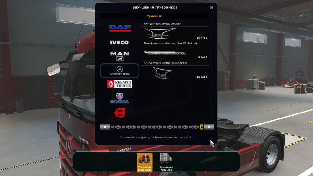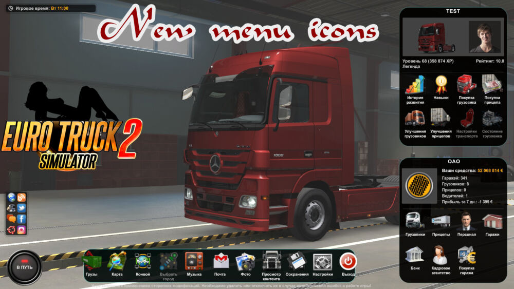 A modification that changes the standard interface of Euro Truck Simulator 2 – New menu icons; – Icons for the selection of goods and the purchase of trailers; – Menu of recruitment agencies; – Dealers icons; – New gallery menu; – Menu for hiring drivers; Credits: Alik Credits: Alik |
