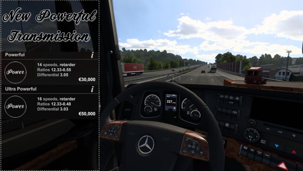Recommended mod with this mod: New Powerful Engines V1.1 [1.49x] Name: Powerful Price: 30.000 Unlock: 1 Level Transmission: 14 Speeds Ratios: 12/13-0.55 Differential: 3.05 Retarder: 3/4/5 Name: Ultra Powerful Price: 50.000 Unlock: 1 Level Transmission: 16 Speeds Ratios: 12/13-0.48 Differential: 3.03 Retarder: 3/4/5 Included: DAF 2021 DAF XD DAF XF DAF XF Euro 6 Iveco Hi-Way Iveco Stralis Man TGX Man TGX 2020 Man TGX Euro 6 Mercedes Actros Mercedes Actros 2014 Renault Magnum Renault Premium Renault T Scania R Scania R 2016 Scania S 2016 Scania Streamline Volvo FH16 Volvo FH16 2012 Credits: YiğitE. Credits: YiğitE. |