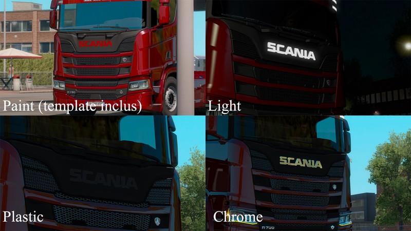 Old Logo scania, 4 variants standalones * Painted ( with template) * Lighted * Chromed * Plastic Works on Scania Next Gen and All Scania by RJL Credits: HorseeHorse Modding |
