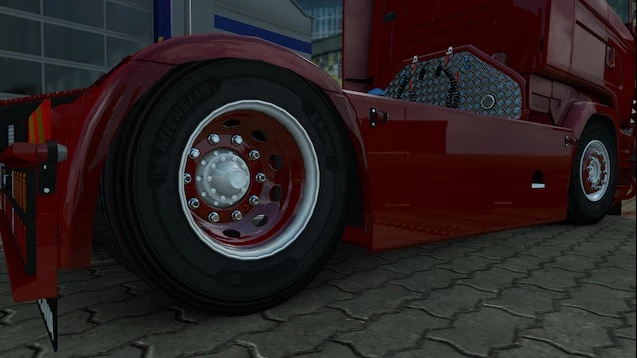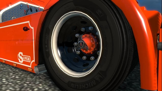 FOR ALL TRUCKS! Includes: 9 front wheels in 9 colors (Red, bordeaux red, blue, yale blue, black, orange, carrot orange, “Sneepels” and yellow) 9 rear wheels in 9 colors (Red, bordeaux red, blue, yale blue, black, orange, carrot orange, “Sneepels” and yellow) 1 paintable front wheel and 1 paintable rear wheel! Paintable hubs! Paintable Scania hubs! Custom hub covers! (The chrome ninja styled throwing blade) Works on 1.40 Credits: Rollo |