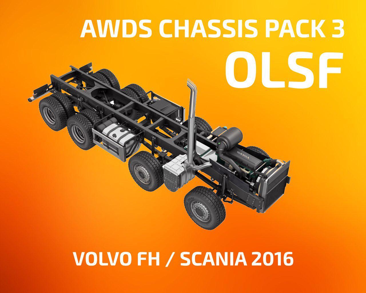Compatible versions: ETS2 1.31 / 1.32 / 1.33 beta Supported trucks: Volvo FH, Scania 2016 Buy a new truck and set high priority for use this mod. OLSF Chassis Pack 3 improves your truck adding better grip, handling, stability and fuel autonomy. Includes: – All Wheel Drive (AWD) system – All Wheel Steering (AWS) system – Optimized weight distribution – Extended fuel/AdBlue capacity Chassis included: – OLSF iAWD/S 4×4 ER – OLSF iAWD/S 8×8 ER Changelog (3.0): – Beta support for ETS2 1.33 Thank you all for your downloads, comments and videos. Credits: OLSF Credits: OLSF |