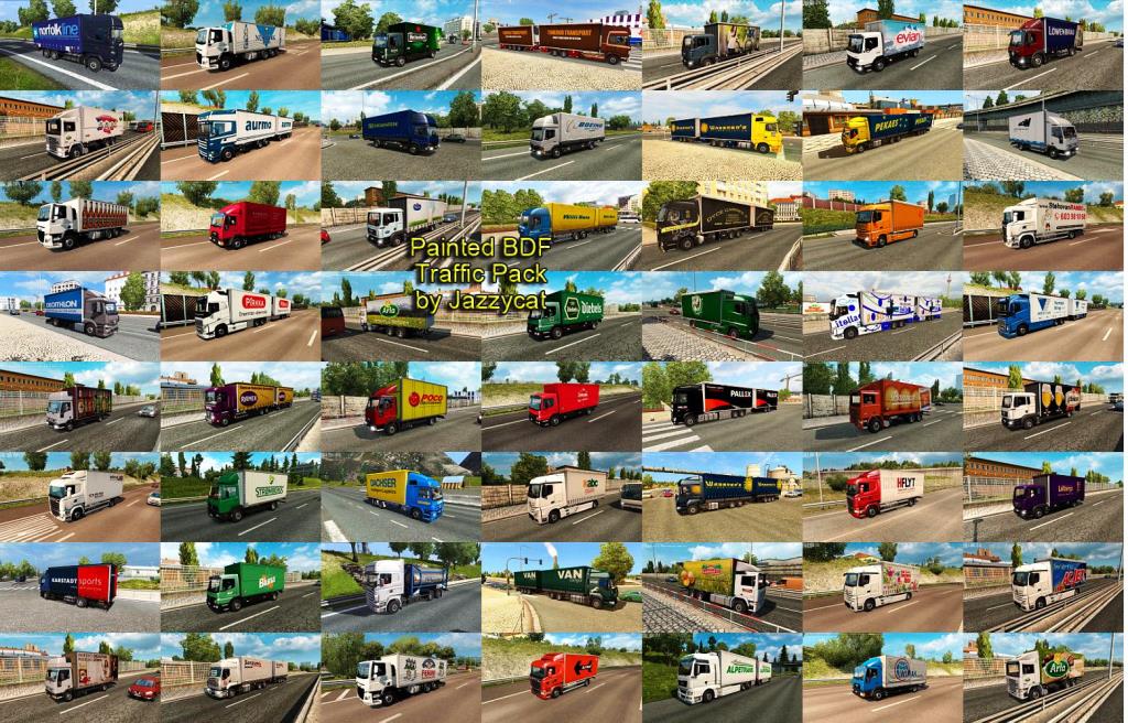 MOD PAINTED BDF TRAFFIC PACK V9.6 FOR EURO TRUCK SIMULATOR 2 Pak adds 567 BDF to traffic with trailers with skins of real companies. Everything is spelled out separately, nothing replaces. Works on any cards. For version 1.40.x Version 9.6 - added skins of Spanish and Portuguese real companies Credits: Jazzycat |