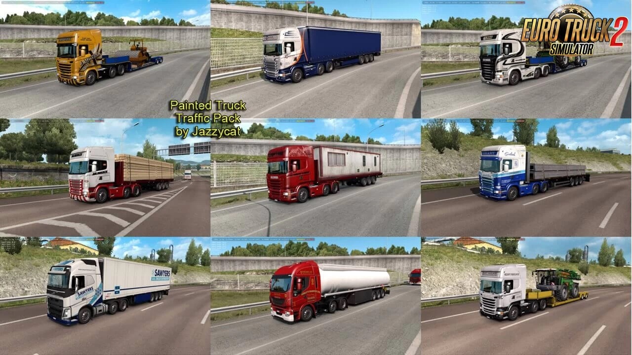 Painted Trucks in Traffic Pack v12.8 (1.40.x) Version 12.8 – added new companies: Transportes El Junza, Trans-Grau, Grupo Carreras(two trailer skin variants), Cayco, Estrella Galicia Pack adds in traffic truck+trailer combo with skins of 1016 real companies. All standalone. Works on any maps. Tested on 1.40.x Compatible with all my packs. Skins: TerRay, ScaniaLAD, IJ’s Mods, AJFV1998, Millsyb, Speedy66666, harry, Sky76, JE80, Trucker2011, KHAOS-XX, RCPHiL, S&S-Skinning, Fred_be, Woody, nportegies, Repin, BartvHam, Barttt, ThreeGlavModz, MaxLowe, Freddy Jimmink, Elitesquad Modz, Zoso, Bluemanc, stewowe, Toft-N, Sparrow, DHL, SISL, indian56, radar, Josiesomething, Oswald, Rudy, steini, senator07, lucianandrei, 19vvv05, ryaskins, n.velickovic, ed101, Slenderhun, Futrzaczek99, Farmerbeavis, eskolaite, kriistof, ECdesign, Dragan007, Stephana Stephen, Campinges, DavyBerto, DrRossi, DaviD_SRB, klunk, Bayun4ik, A.Mikhaylov, Pirelli81-HUN, Zeros, Fabry85, onurkull, sagittariusjr, Sogard3, Alik, TheNuvolari, KoviqkS, SilvaTrucker, R3AP3R, Roman71, Lost Virtual and others. Credits: JC |