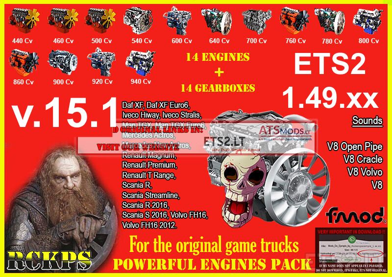 Powerful Engines & Gearboxes Pack v15.1 for ETS2 1.49.xx by krmxszn 14 different engines; 440, 460, 500, 540, 600, 640, 700, 760, 780, 800, 860, 900, 920 and 940 HP. 4 different types of sound for motors: Typical V8, V8 Open Pipe, V8 Crackle and V8 Volvo. 14 gearboxes. The new gearboxes incorporate 6, 12, 15, 16 and 18-speed models. Sounds and Engines: – Typical V8 sound for engines: 440, 460, 500, 700 and 860 HP. – Open Pipe sound for: 540, 760 and 900 HP. – V8 Crackle sound for: 600, 780 and 920 HP. – Volvo V8 sound for: 640, 800 and 940 HP. With which trucks can I use this mod? The boxes and engines are adapted for all original trucks in the game. Changes in the Powerful Engines & Gearboxes Pack v.15 for ETS2 1.49.xx: – All files were checked for 1.49 version. – Support for new trucks are added. – Major adjustment on torque curves and RPM values of engines. – The transmission-related problem has been fixed. Credits: Models: SCS Sounds: kriechbaum, SCS Creation and assembly of benches: Rockeropasiempre, krmxszn Testers: Cupido, Alejandro R35, RCKPS, krmxszn Credits: Rockeropasiempre, krmxszn |