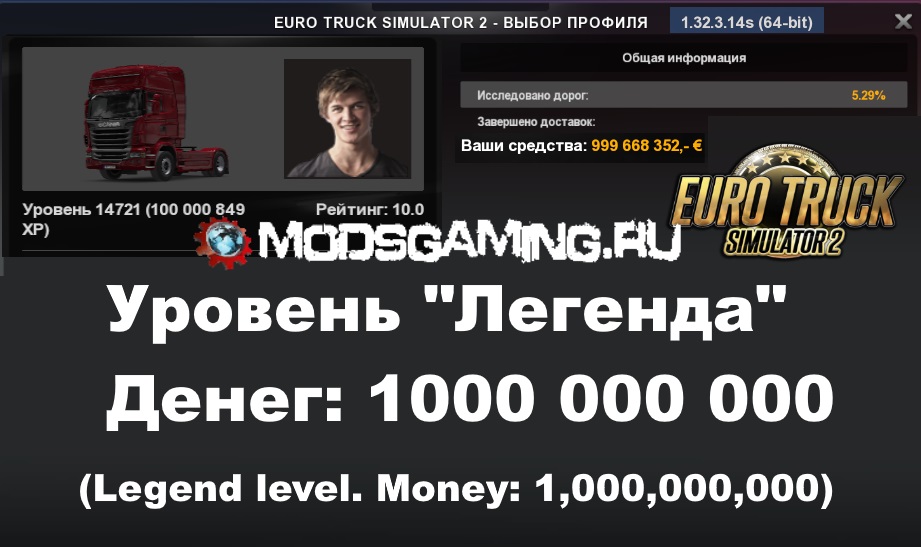 Profile for Euro Truck Simulator 2 (1.32.3.14.s) 1000 000 000 money Legend level Map scanned at 5.29% Credits: MODSGAMING.US |
